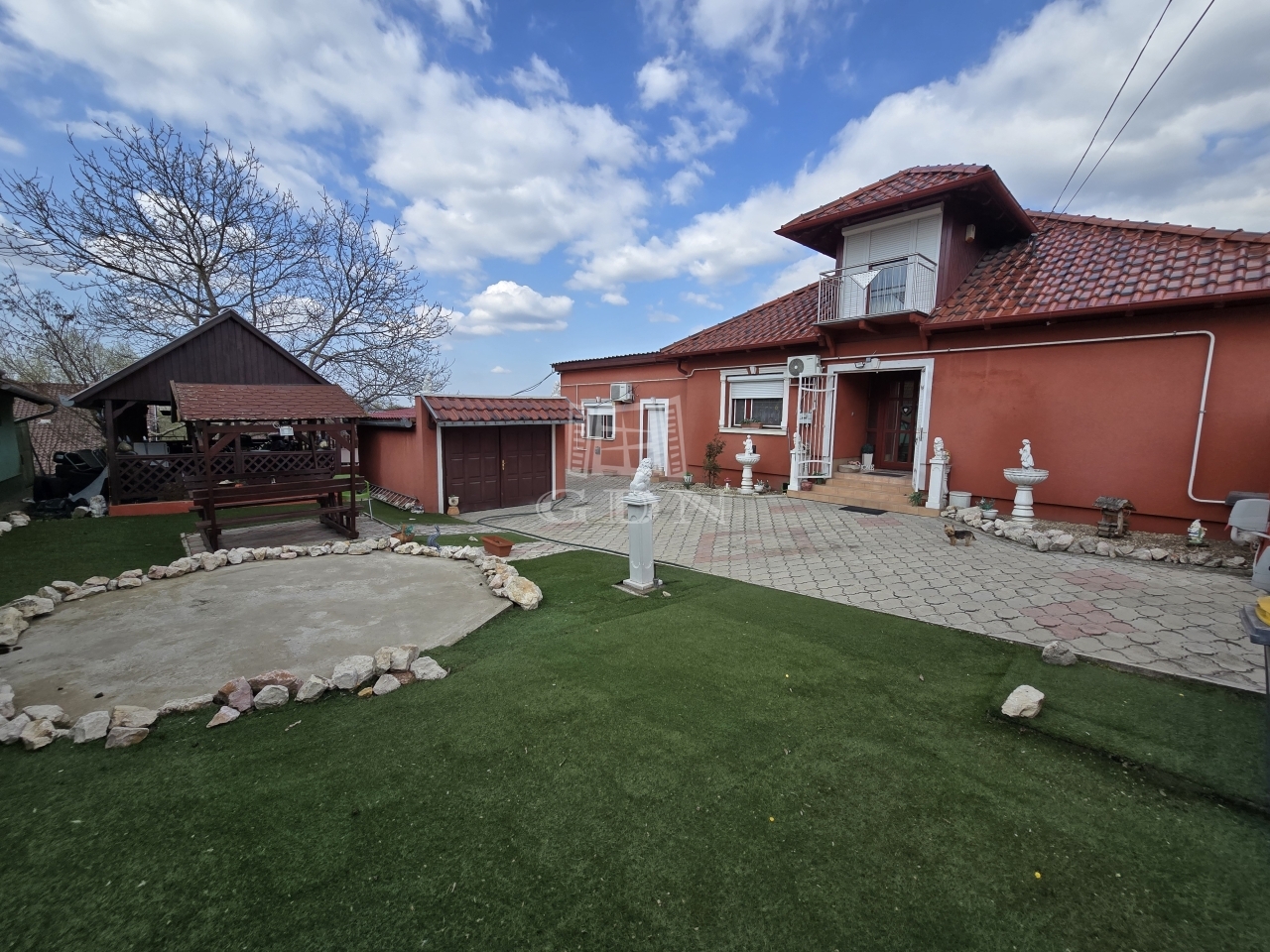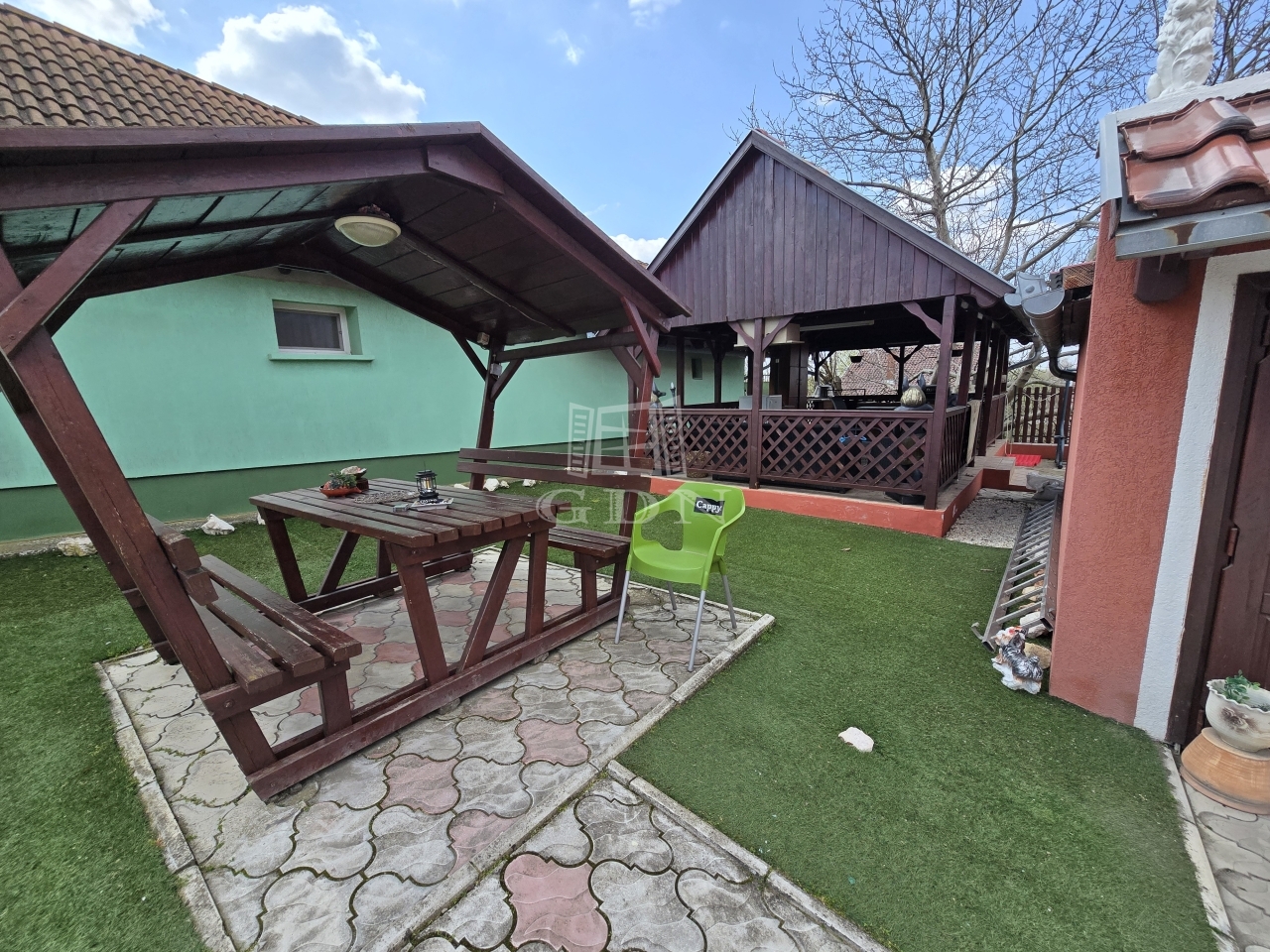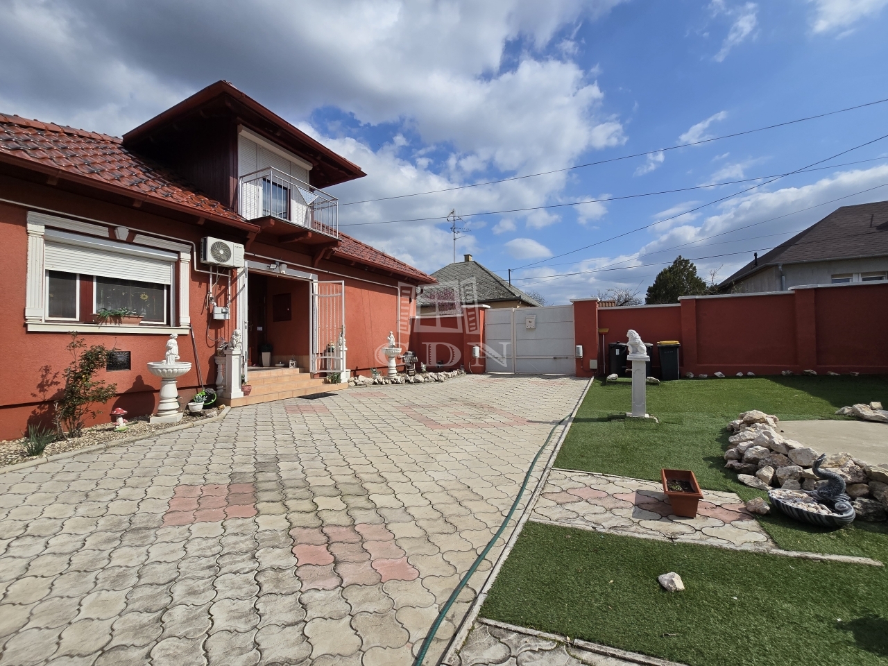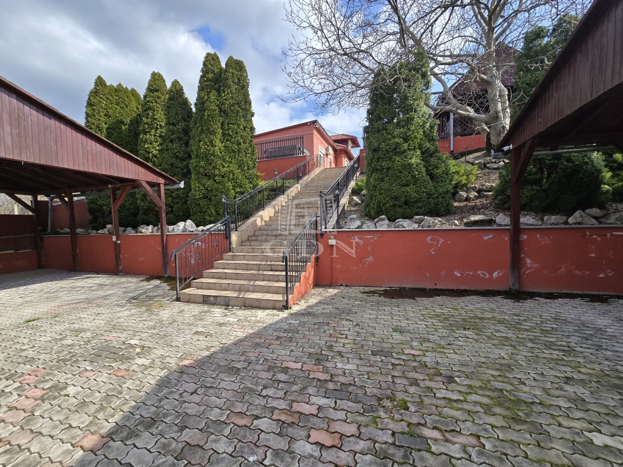 Az alsó udvar szintén részben térkövezett, és külön utcáról is megközelíthető. Itt két fedett gépkocsibeálló került kialakításra, amelyek alatt akár több jármű parkolása is kényelmesen megoldható, így az ingatlan nemcsak nagycsaládosok számára ideális, hanem akár vállalkozási vagy befektetési célra – például szállásadásra – is kiváló lehetőséget kínál.