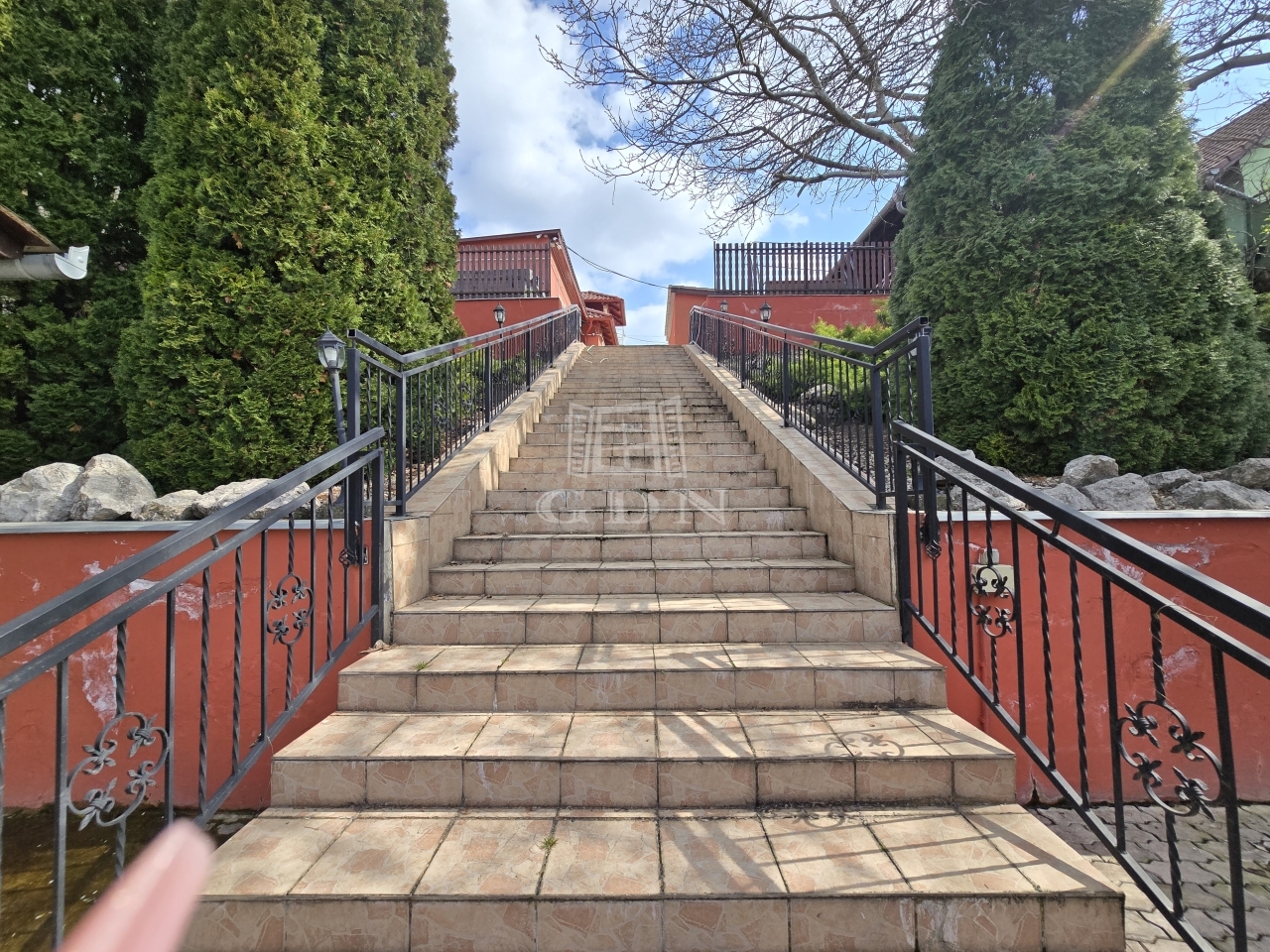 A felső és alsó udvarrészt egy hosszabb, karakteres lépcsősor köti össze, amely egy zöld, fásított, virágos kertszakaszon halad keresztül, különleges, szinte park jellegű átmenetet képezve a két tér között.
