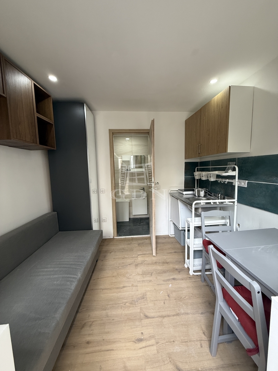 A tér maximálisan kihasznált: egy kis konyha étkezőasztallal, ahol kényelmesen elfogyasztható a reggeli kávé, valamint egy kanapé, amely estére ággyá alakítható, így nappal tágasabb, este pedig kényelmes pihenőtérré válik a lakás. A fürdőszobában modern walk-in zuhany került kialakításra.