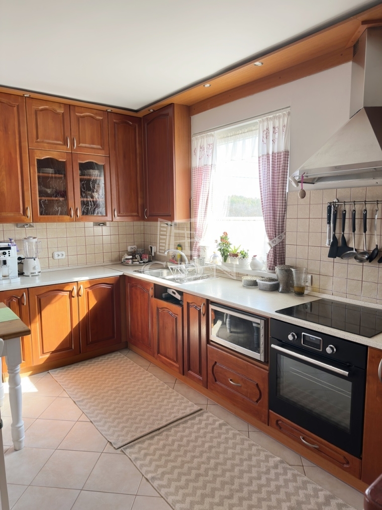 A nagyméretű műanyag ablakoknak köszönhetően az egész élettér világos és barátságos. A nappaliból egy fedett terasz biztosítja a kertkapcsolatot.