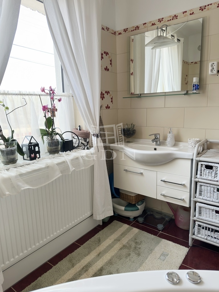 Az emeleti szinten két félszoba, egy fürdő w.c.-vel, valamint egy erkélyes hálószoba kapott helyet, kilátással a Gödöllői dombságra.