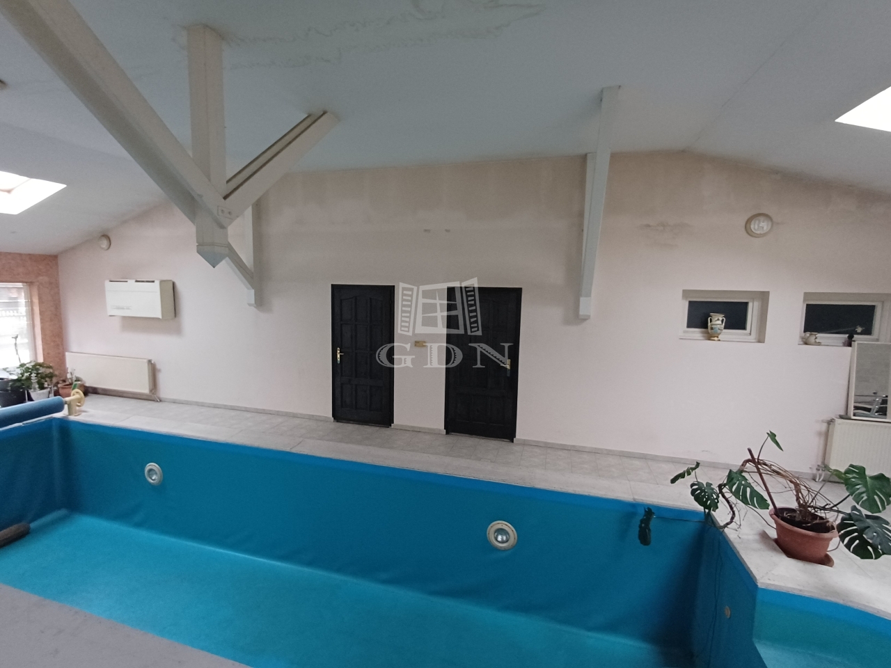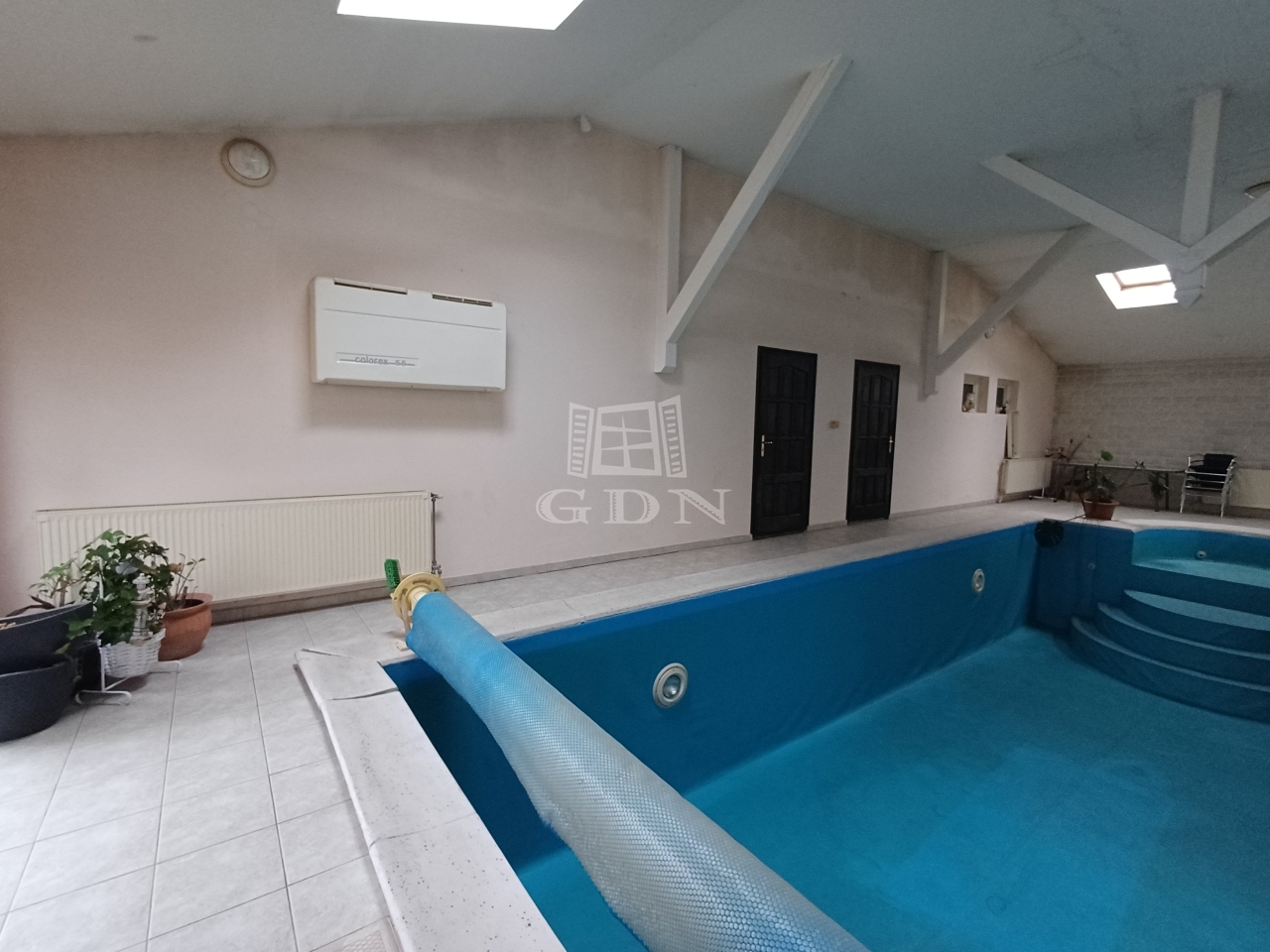 A házhoz tartozik egy fedett, gépesített, 95 m²-es medencetér, amely kis ráfordítással újra álomszép wellness résszé alakítható.