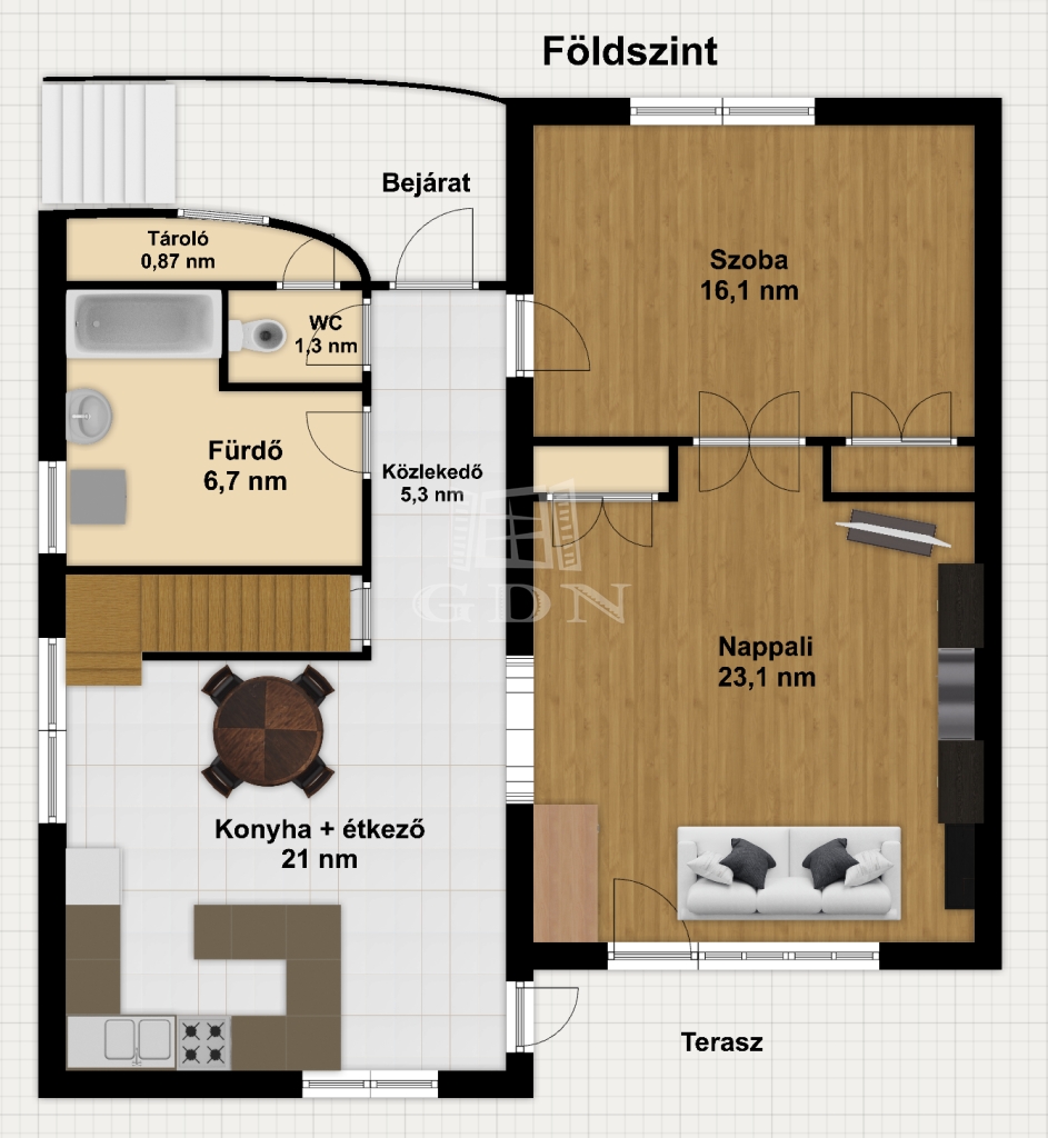 A belső kialakítás átgondolt és jól élhető: a földszinten amerikai konyhás nappali került kialakításra, gépesített konyhával és közvetlen teraszkapcsolattal, további egy külön nyíló háló, fürdőszoba és mellékhelyiségek szolgálják a mindennapokat.