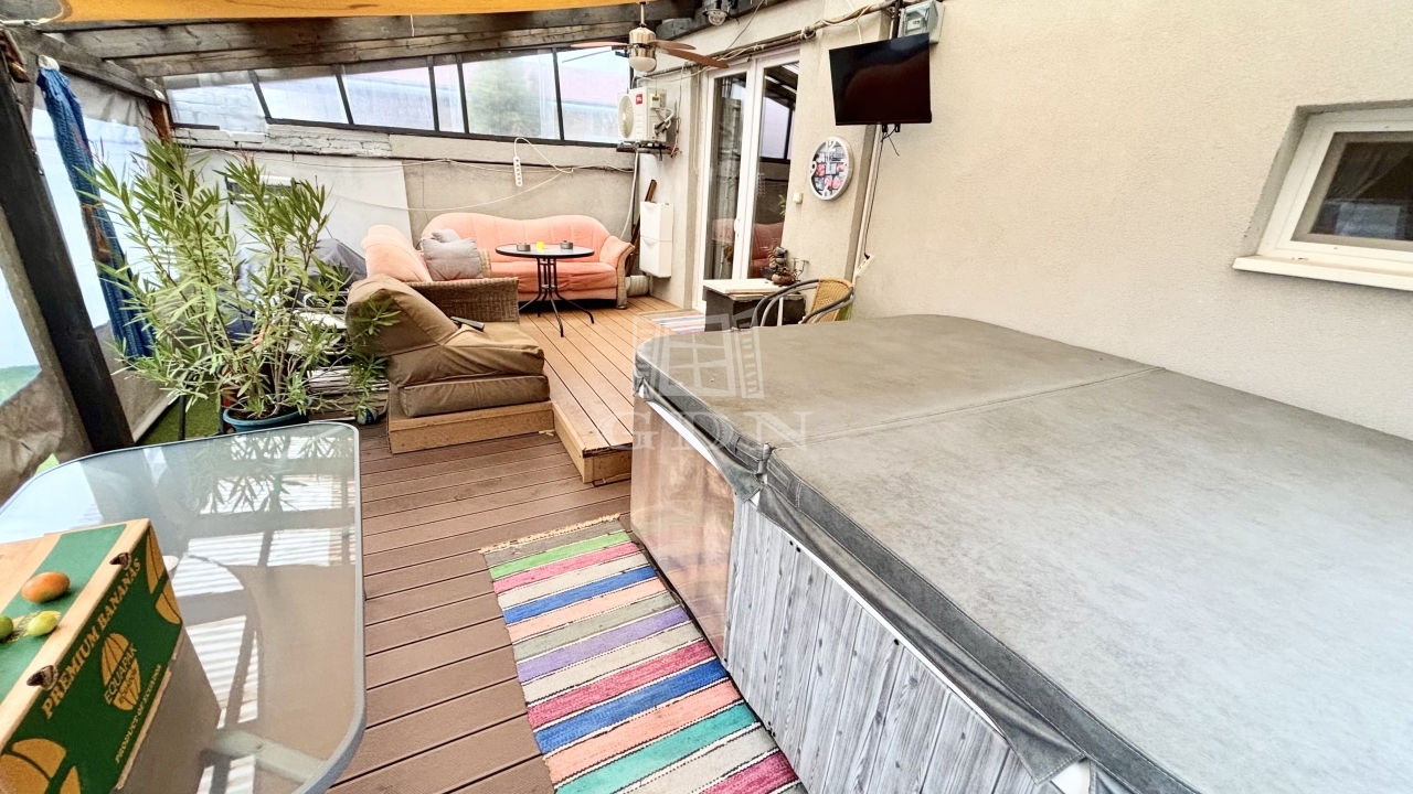 2025-ben esztétikailag belülről rehabilitálták. A nappaliból kilépve és közel 30 nm-es fedett terasz található jacuzzival, mely a vételár részét képezi.