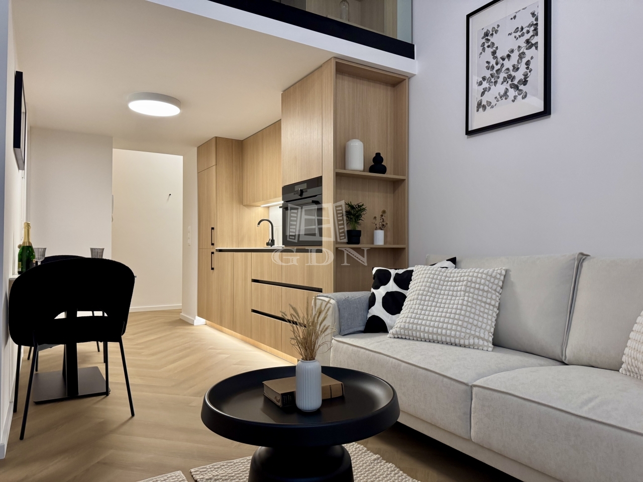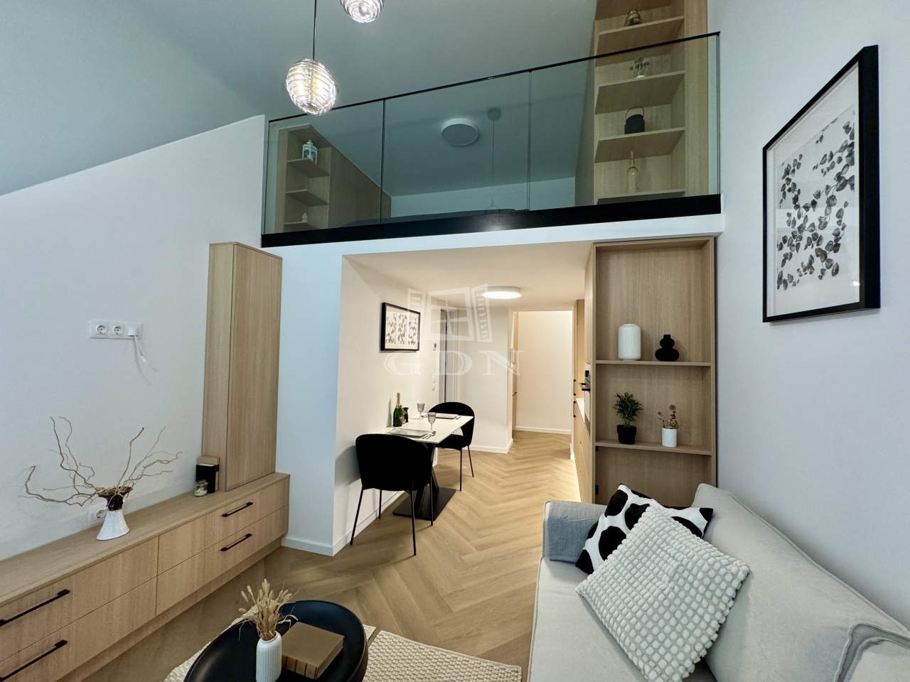 A lakás magas belmagassága lehetővé tette egy 11,68 m²-es állógaléria kialakítását, amely hálószobaként és extra tárolóként is funkcionál, így a tér jóval tágasabb és kényelmesebb a megszokottnál.