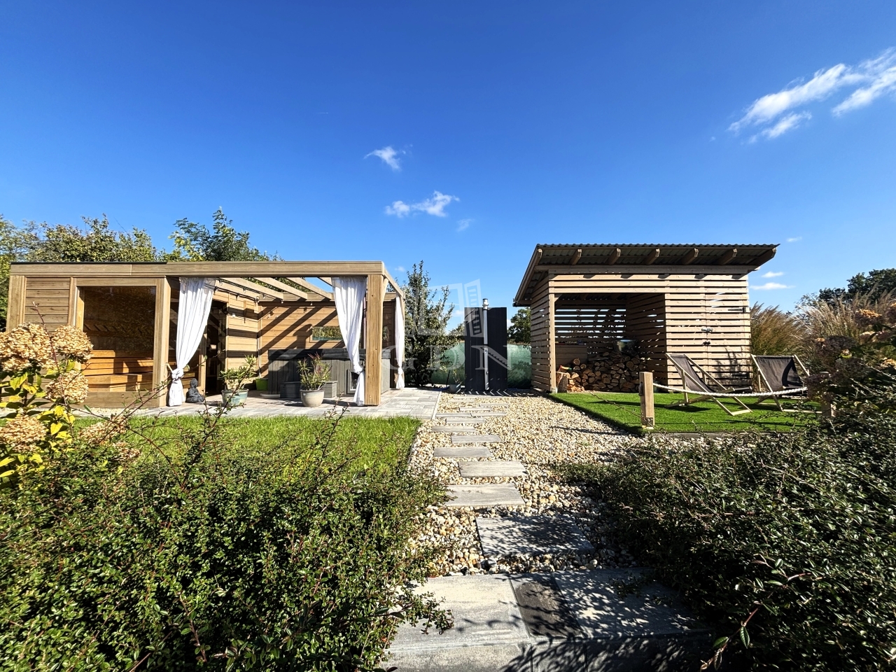- KÜLÖNÁLLÓ WELLNESS ÉPÜLET szaunával, dézsával, kinti zuhanyzóval, FEDDETT PIHENŐRÉSSZEL és hangulatos esti világítással.