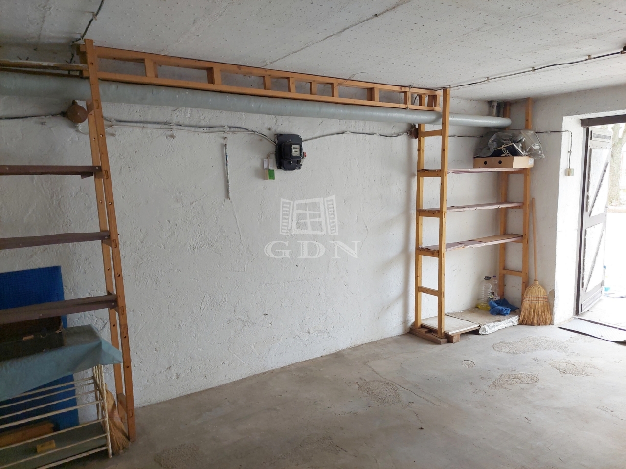 A garázs állapota jó, akár kisebb üzlethelyiség vagy iroda is kialakítható belőle. Az oldalfalaknál polcozás lett kialakítva, így tárolóként is hasznosítható.