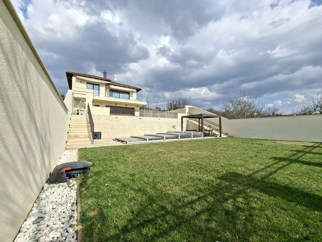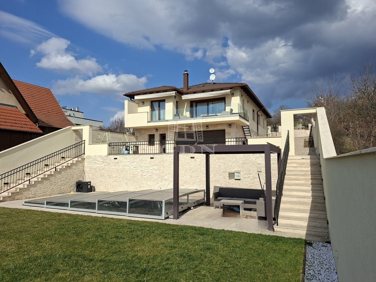A lankás teleknek köszönhetően utcafronton 1, a kert felé pedig 2 szintes az épület. A pince szinten 2 állásos, tágas garázs, tároló résszel, egy nyárikonyha és egy zuhanyzó kapott helyet. A földszinten 4 szoba, 2 fürdőszoba és hatalmas, tágas nappali egy légtérben, mégis némileg elkülönülten található az étkező és a teljesen felszerelt konyha. A nappaliból nyílik az erkély, ahol kényelmesen elfér egy 6-8 személyes étkezőasztal. A teraszról és a pince szintről is a kertbe jutunk, ahol a csodálatos panoráma mellett egy medence is elénk tárul, amit a kiépített hőszivattyús rendszerrel fűteni is tudunk. A kertben automata (robot) fűnyíró gondoskodik a tulajdonosok kényelméről.