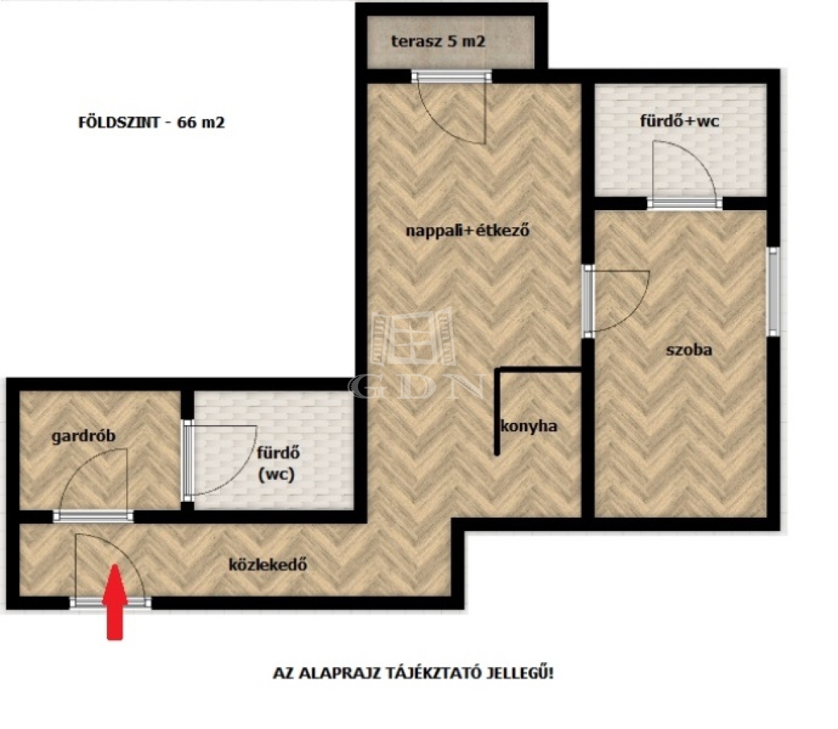 FÖLDSZINT – 66 m2 – 2 szoba – 2 fürdő – gardrób + 5 m2 terasz