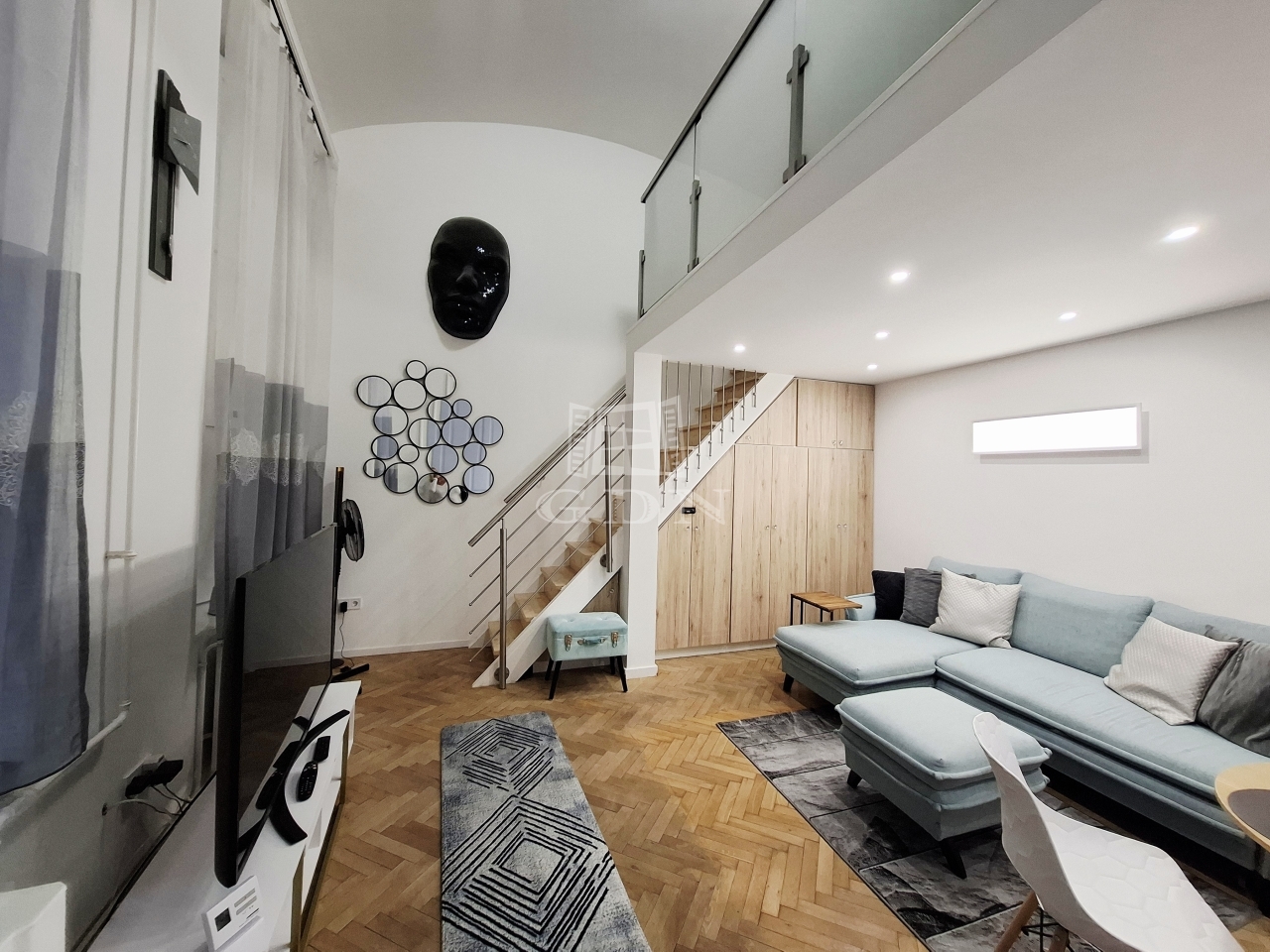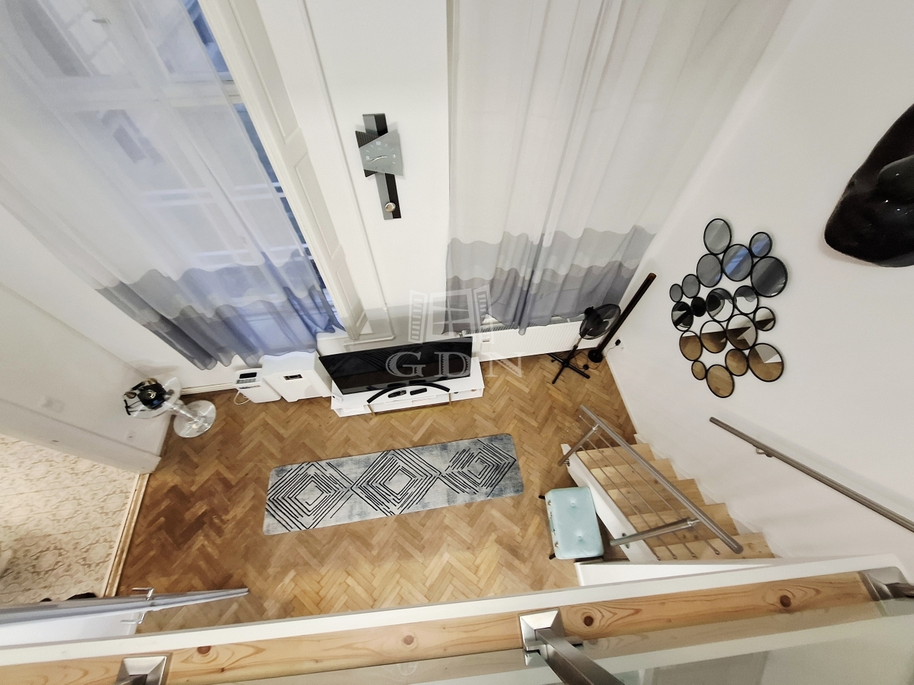 A lakás 5 méteres belmagasságának köszönhetően a nappaliban teljes értékű állógaléria került kialakításra, amely jelenleg külön hálószobaként funkcionál.