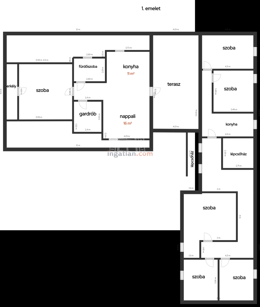 A felső szinten amely külön bejáratú, 2 szoba, amerikai konyha, fürdőszoba, és két hatalmas napfényes terasz tartozik. Ennek kialakítása az új tulajdonosra vár, saját ízlésének megfelelően.
