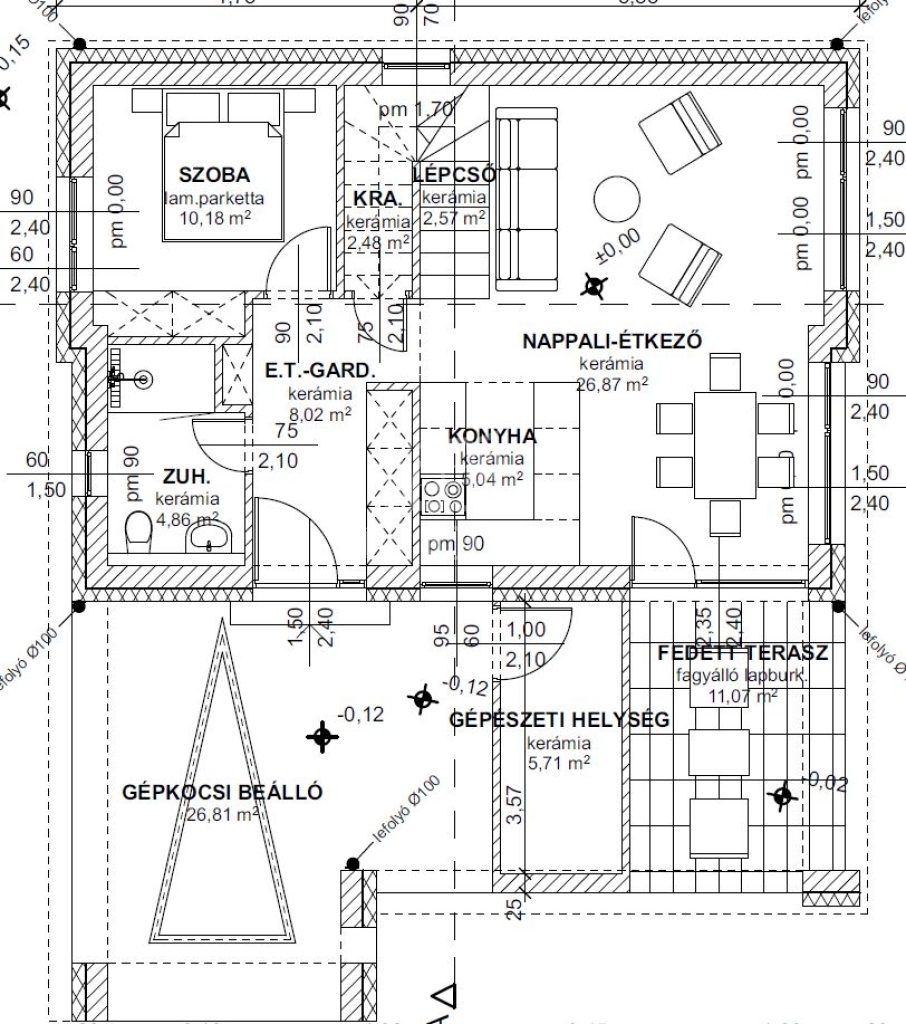 - Falazatok: külső-belső teherhordó falak: POROTHERM 30 X-Therm., belső válaszfal: POROTHERM 10 NF
