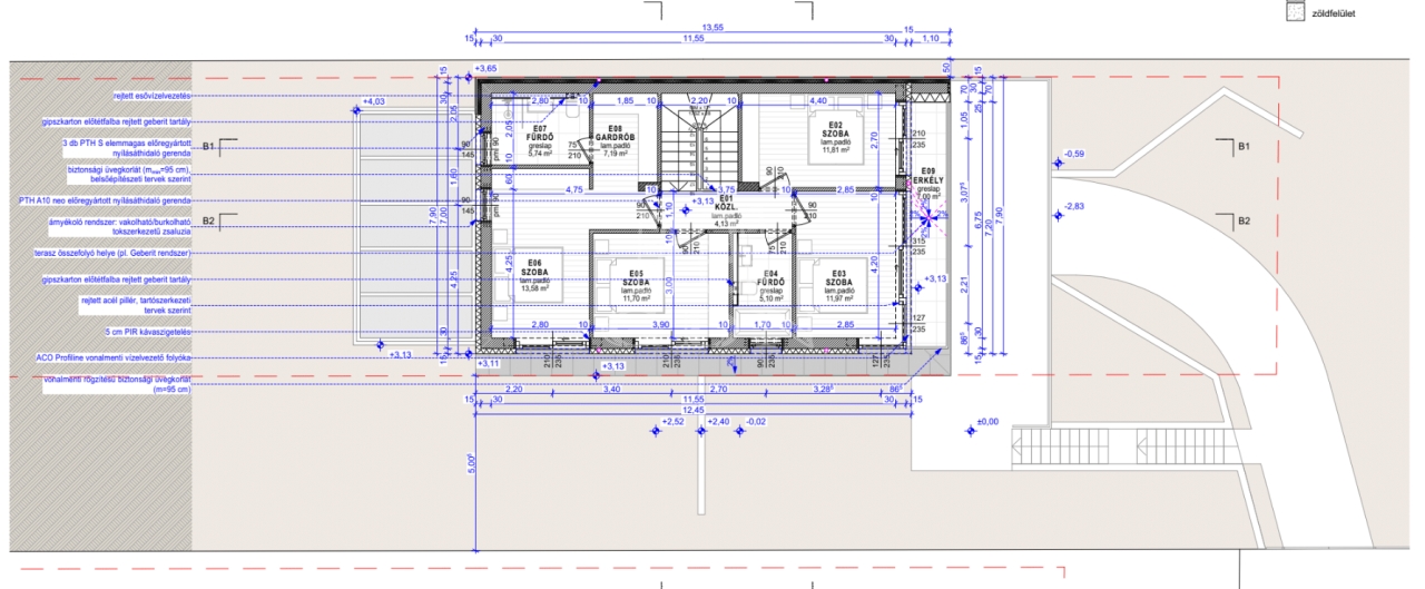 Szerkezet: YTONG falazat 15 cm szigeteléssel, PIR hőszigetelt lapos tető.