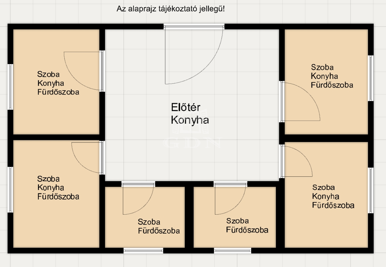 Az ingatlan a második emeleten található egy rendezett, liftes társasházban, és különlegessége, hogy 6 külön lakóegység került benne kialakításra. A lakásban 4 konyha és 6 fürdőszoba található, minden egység külön nyíló, és saját használatra kialakított, így a vendégek teljes kényelemben élvezhetik az ott-tartózkodást. Az előtérben található még egy közös konyha és étkező is.