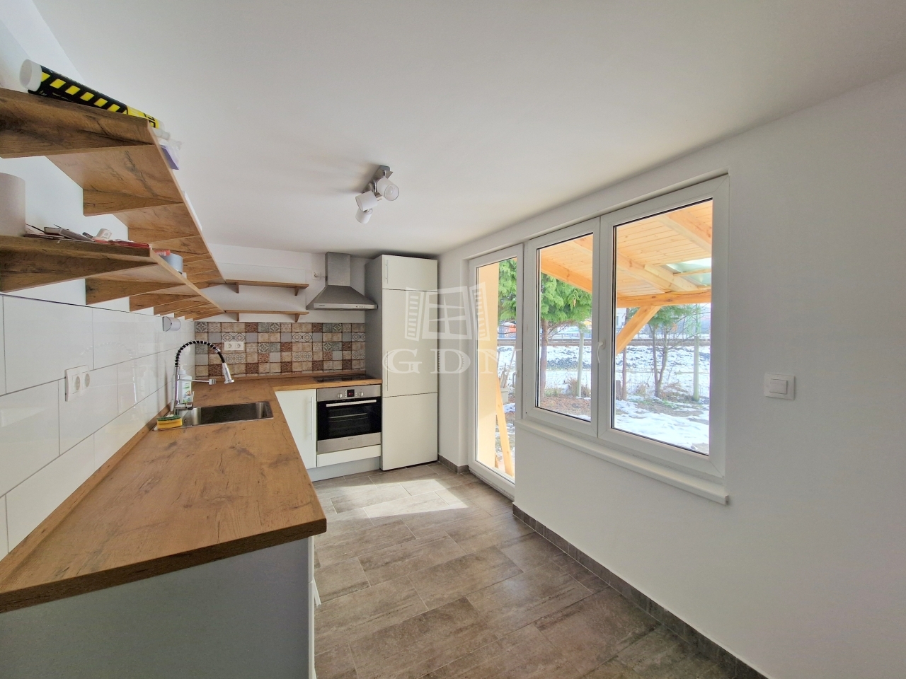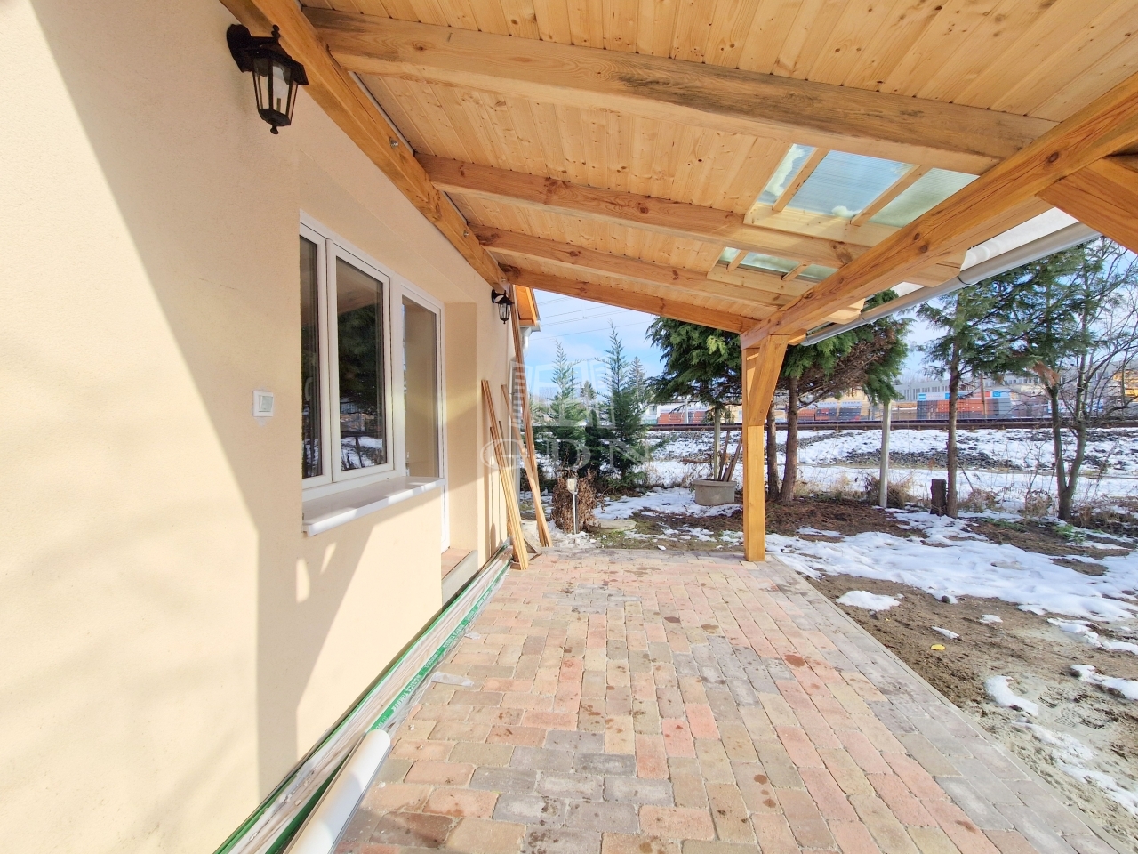 Tulajdonosa kényelmét szolgálja egy fedett. ám benapozott terasz, mely a konyhából elérhető.