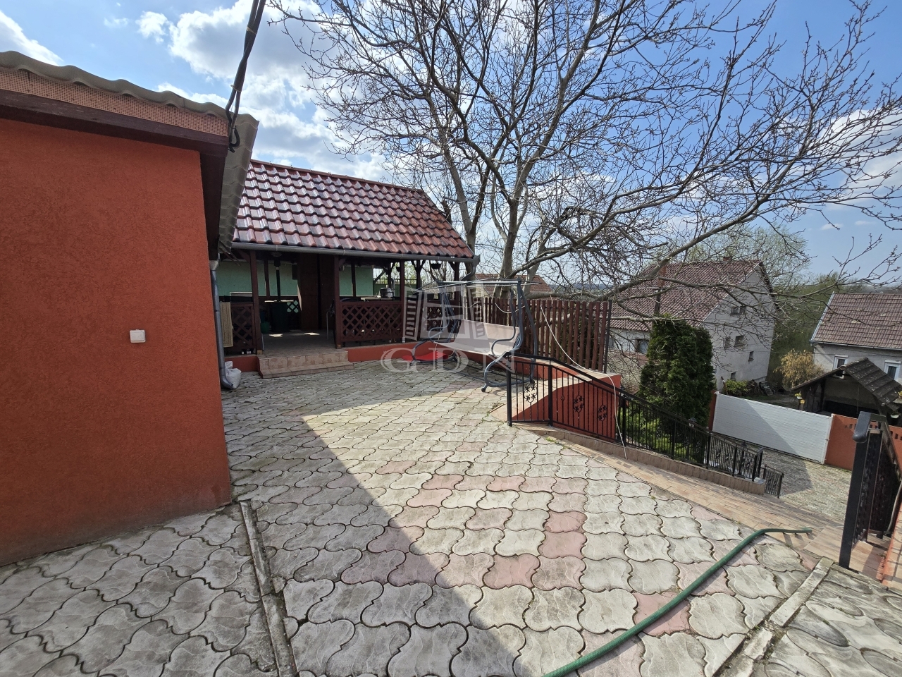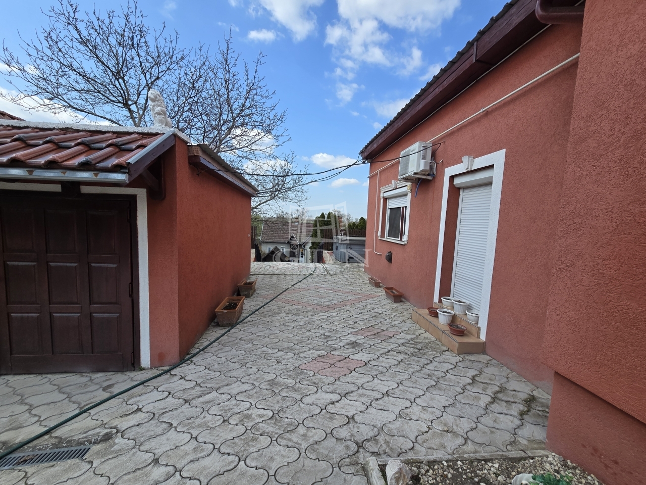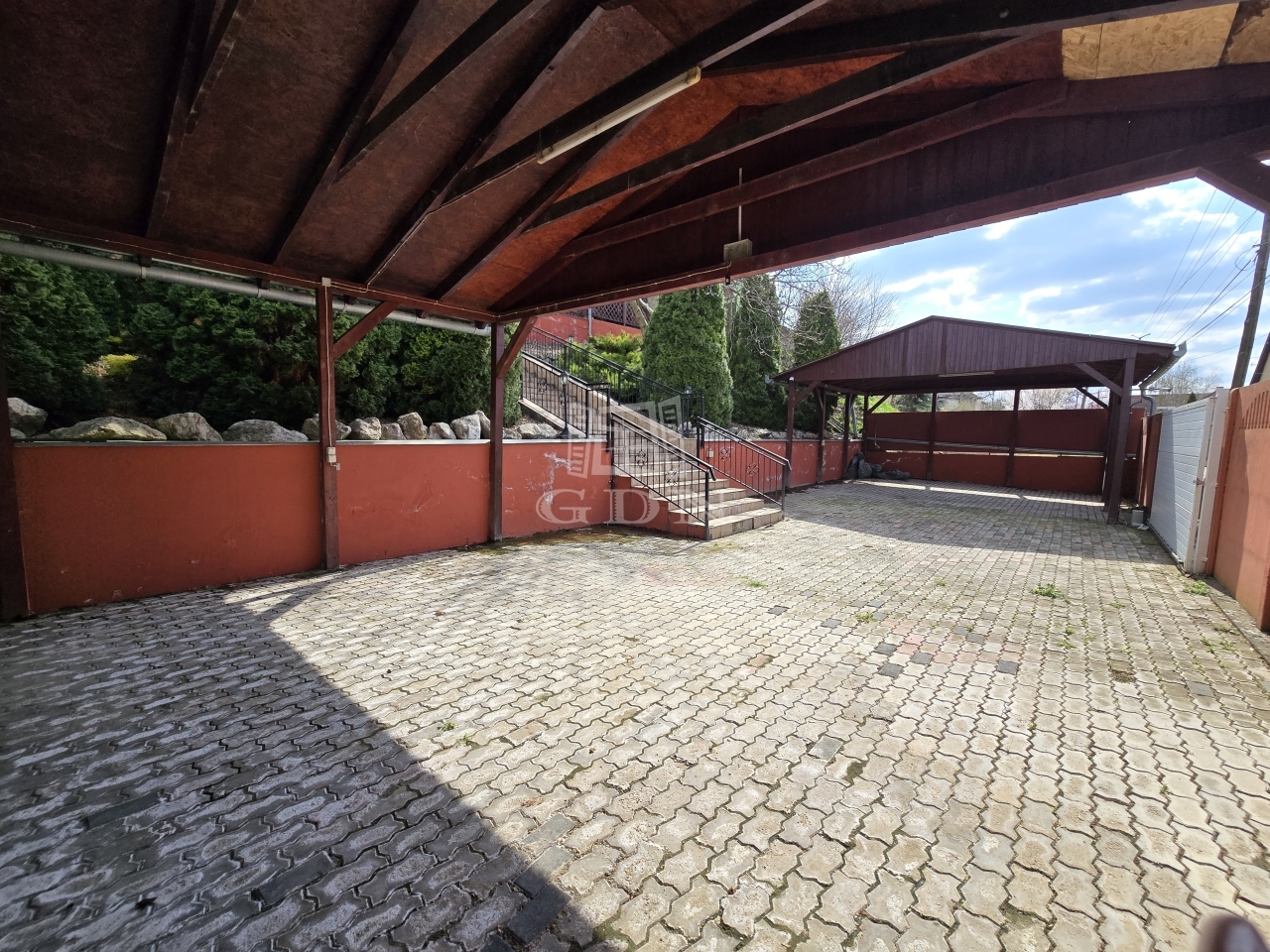 Az alsó udvar szintén részben térkövezett, és külön utcáról is megközelíthető. Itt két fedett gépkocsibeálló került kialakításra, amelyek alatt akár több jármű parkolása is kényelmesen megoldható, így az ingatlan nemcsak nagycsaládosok számára ideális, hanem akár vállalkozási vagy befektetési célra – például szállásadásra – is kiváló lehetőséget kínál.