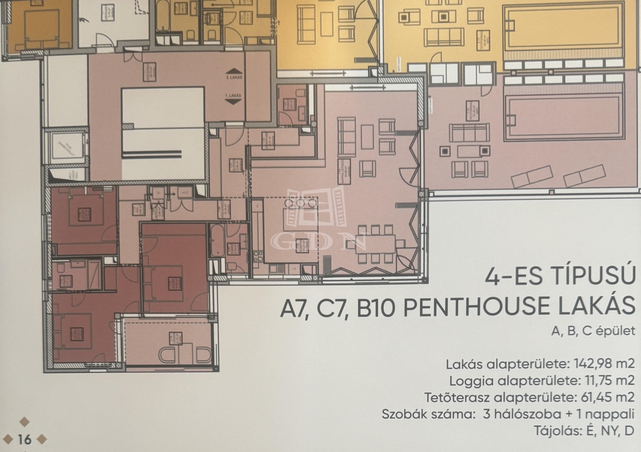 Az C/4-es típusú első emeleti lakás 115,91 négyzetméteres, tartozik hozzá 2 loggia amelyek alapterülete 24,75 négyzetméter. A 115,91 négyzetméteren amerikai konyha, 3 hálószoba, nappali, gardróbszoba, 2 fürdőszoba, valamint vendég WC is található. A loggián napozhat vagy akár egy jakuzzit is telepíthet. Az ingatlanhoz mélygarázsok és tárolok is megvásárolhatóak.