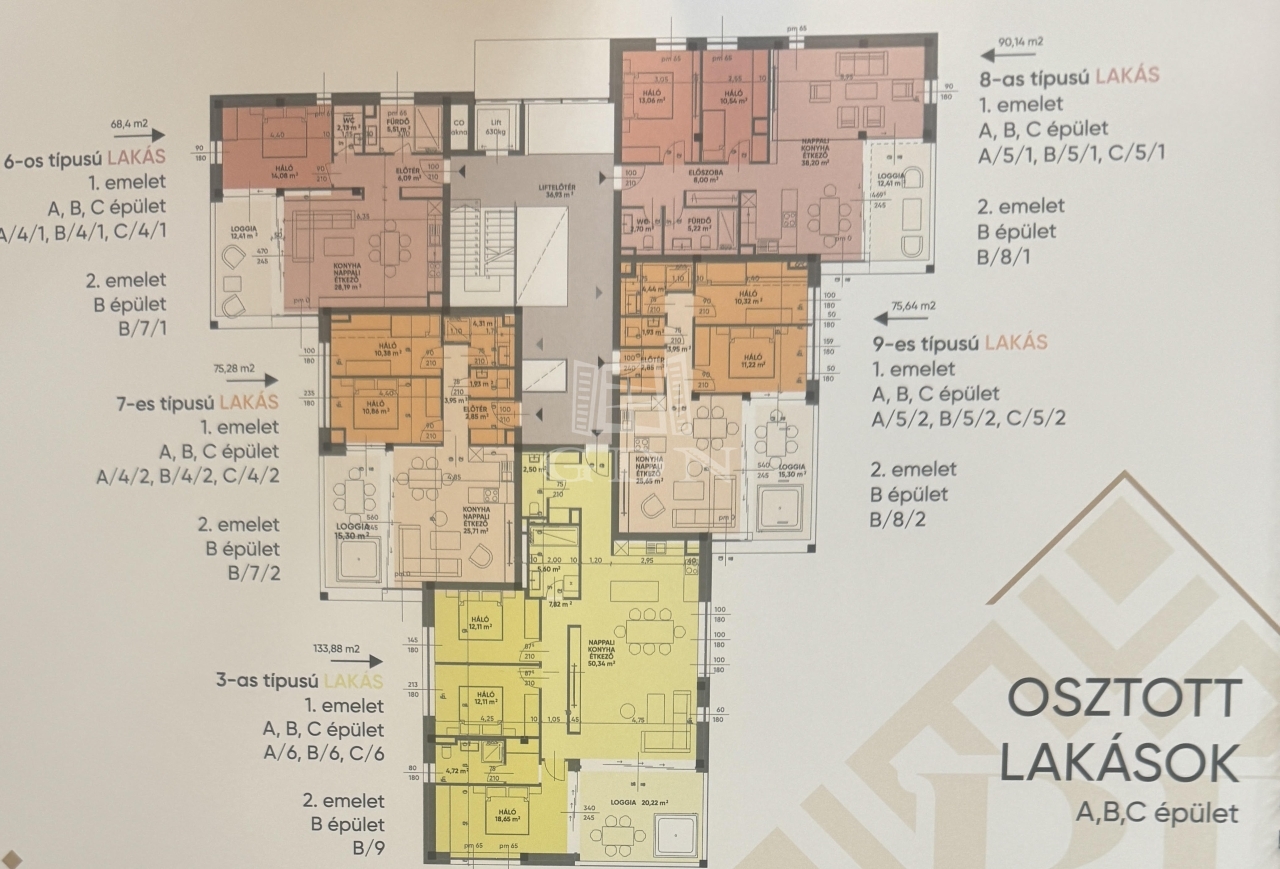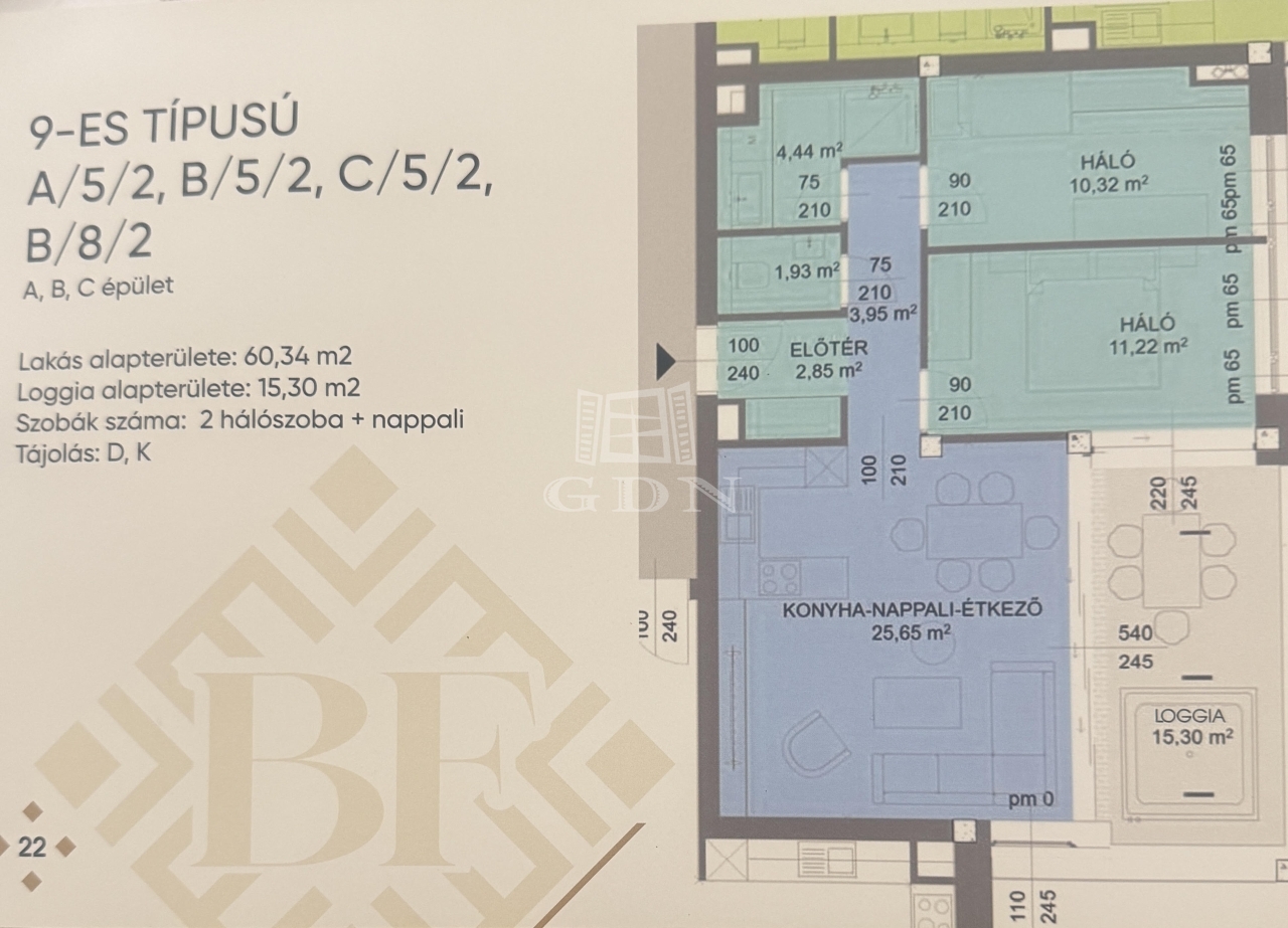 Az A/5/2-es típusú első emeleti osztott lakás 60,34 négyzetméteres, tartozik hozzá loggia amely alapterülete 15,30 négyzetméter. A 60,34 négyzetméteren amerikai konyha, 2 hálószoba, nappali, fürdőszoba, valamint külön WC is található. A loggián napozhat vagy akár egy jakuzzit is telepíthet. Az ingatlanhoz mélygarázsok és tárolok is megvásárolhatóak.