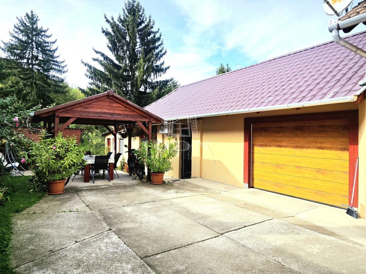 A gondozott kertben fedett szaletli, zárt garázs épült.
