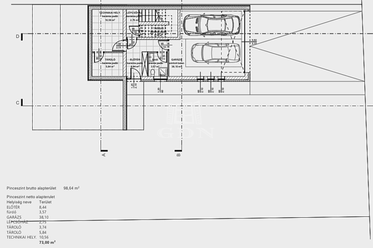 Az alsó szinten található 38 m²-es dupla garázs, valamint további helyiségek – előtér, fürdő, tárolók és gépészet – biztosítják a funkcionalitást és a rendezett életteret.