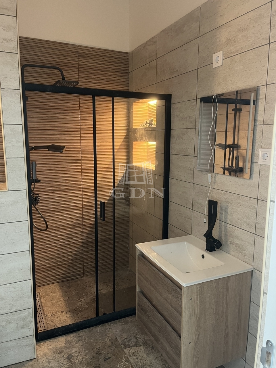 Bathroom: vanity unit, towel dryer, modern shower cabin with sliding door