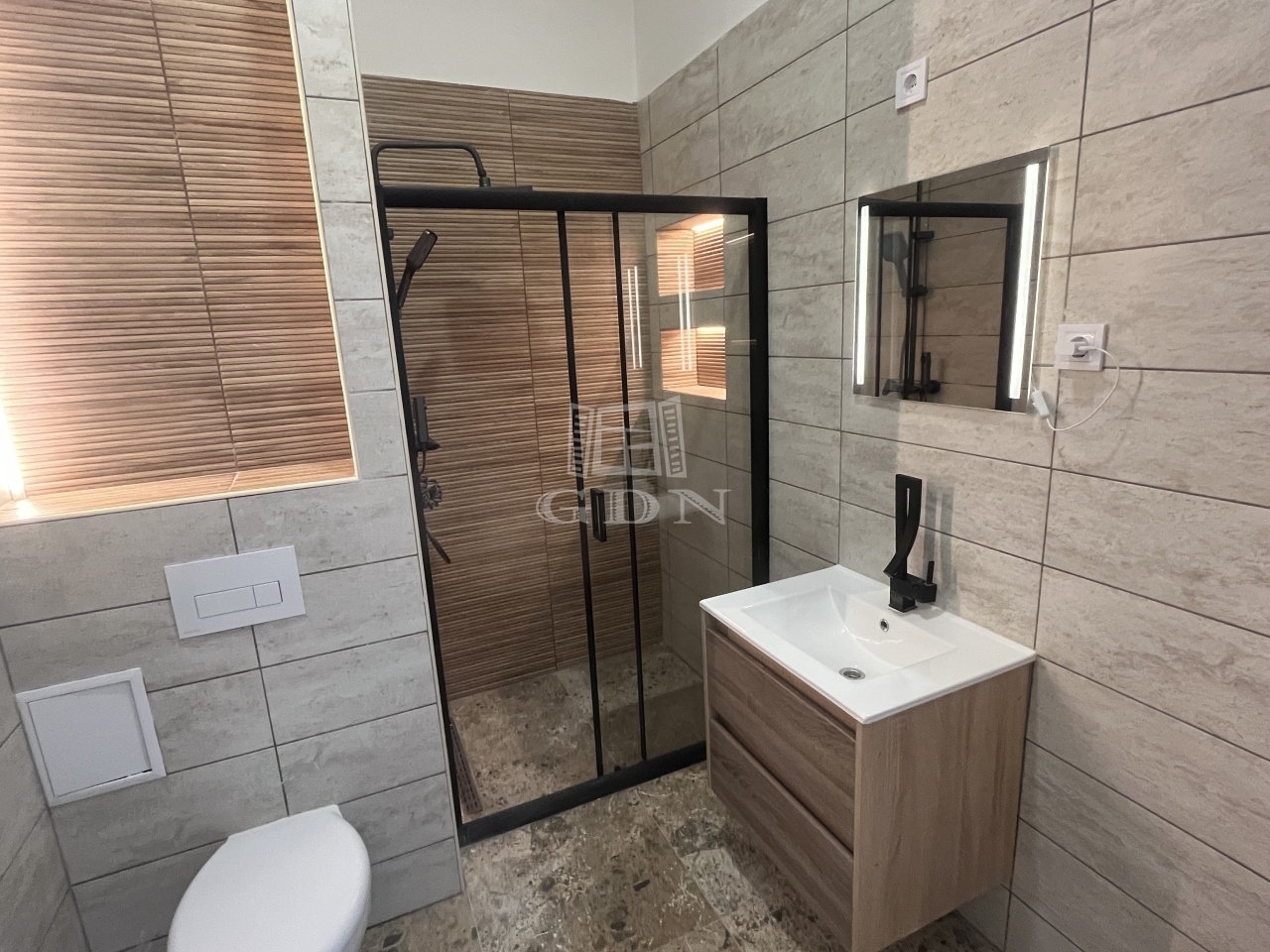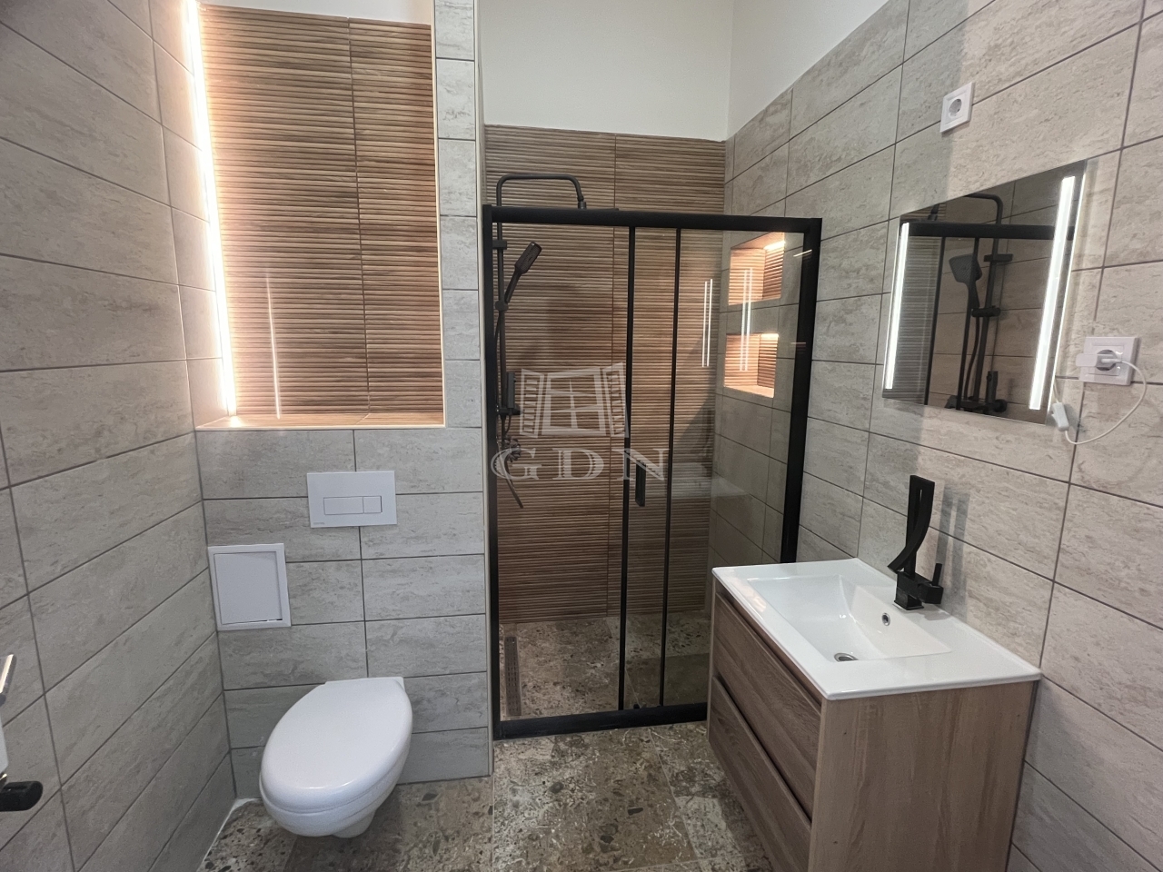 Fürdőszoba: mosdószekrény, törülközőszárító, modern zuhanykabin elhúzható ajtóval