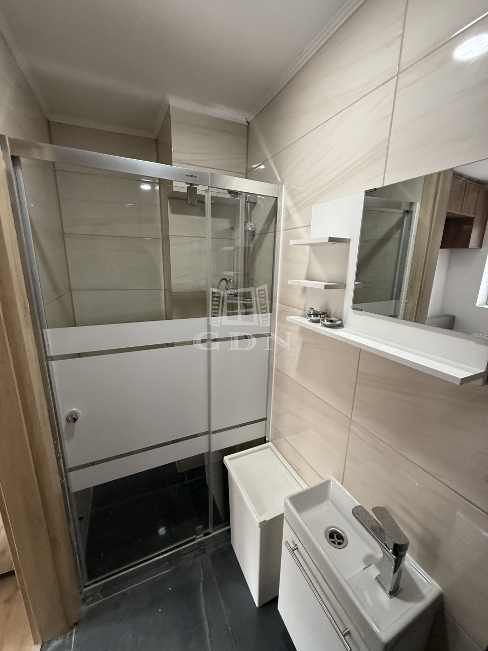 The space is maximized: a small kitchen with a dining table where you can comfortably enjoy your morning coffee, as well as a sofa that converts into a bed at night, making the apartment feel more spacious during the day and transforming into a cozy relaxation area in the evening. The bathroom features a modern walk-in shower.