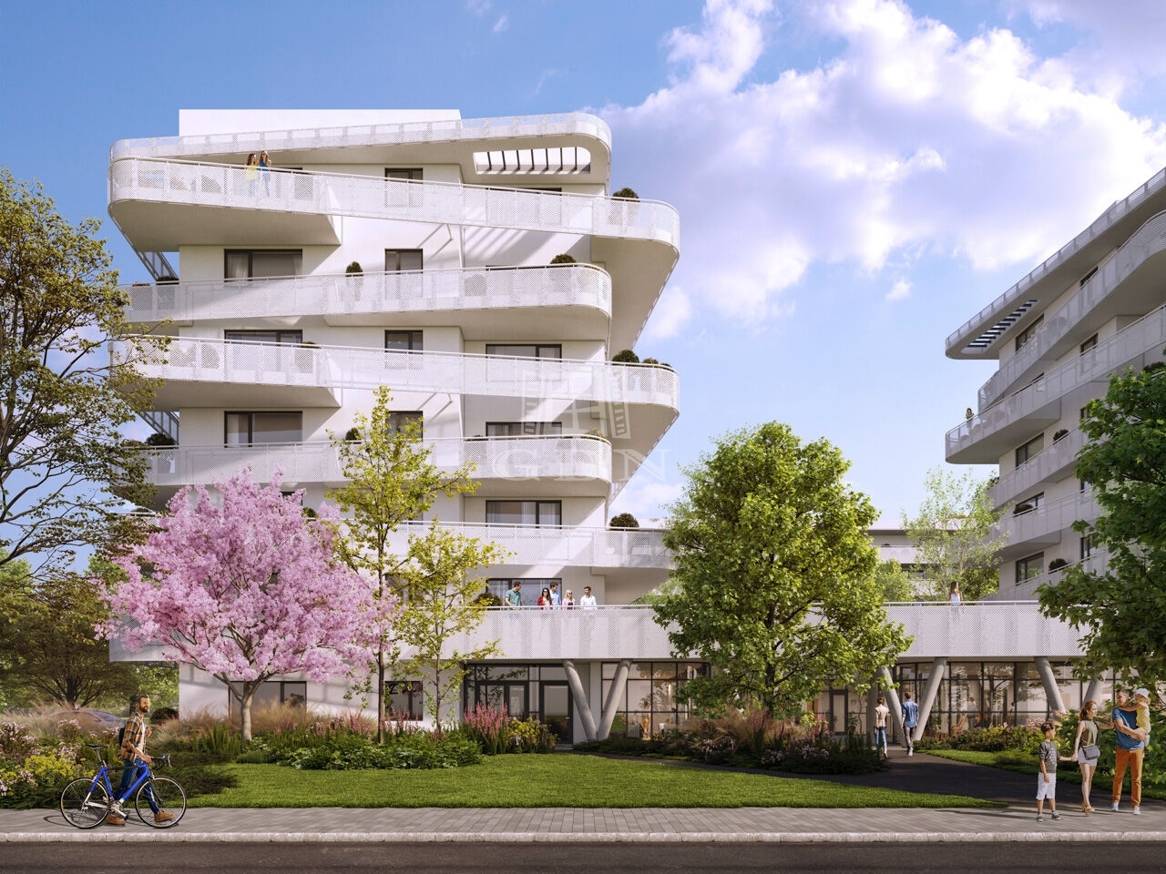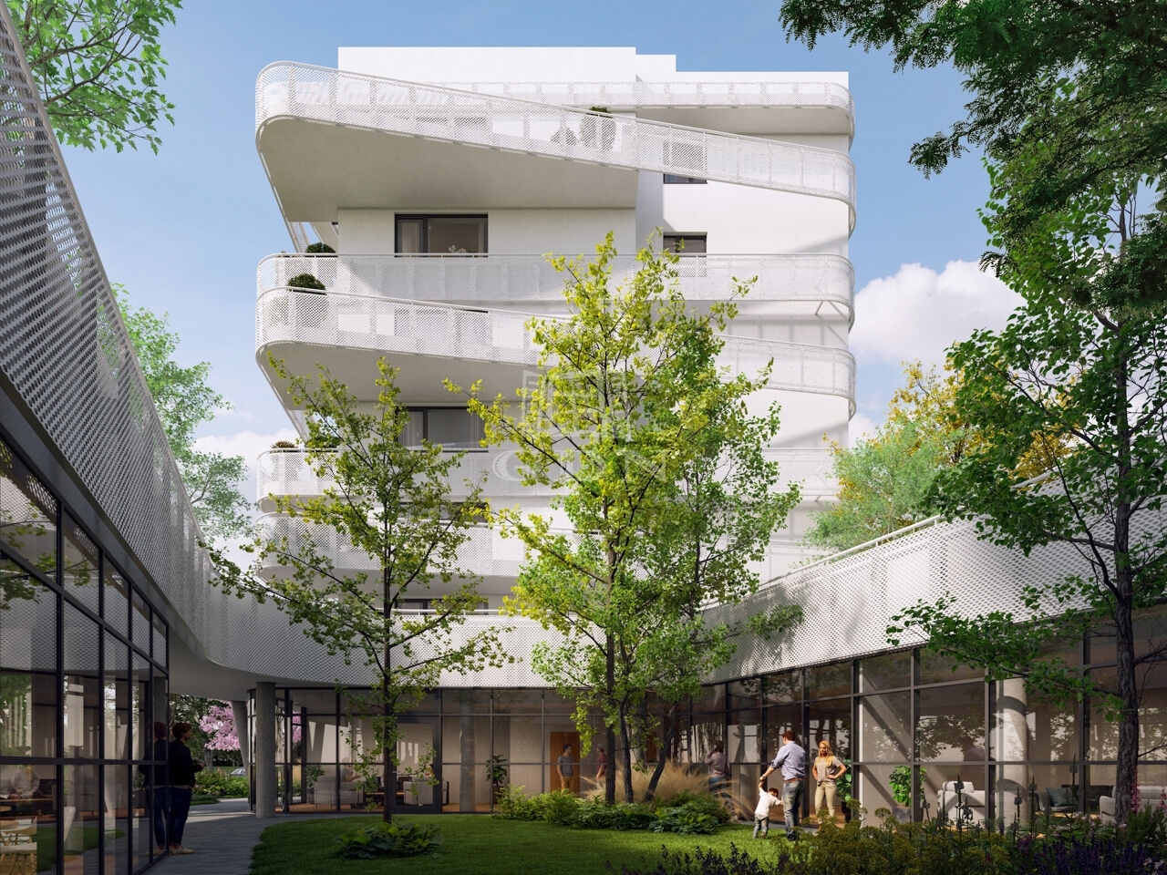 A két épületből álló beruházás során összesen 140 lakás épül, melyek izgalmas vonalvezetésű erkélyei segítik a többlakásos épület harmonikus illeszkedését a ligetes park és a megújult Rákos-patak által létrejövő környezetbe.