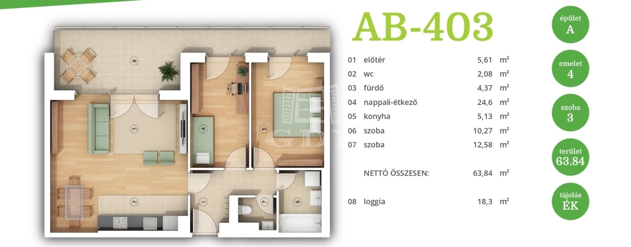 Ez a lakás nappali+2 hálós, 64nm alapterületű és tartozik hozzá egy 18nm-es terasz is.