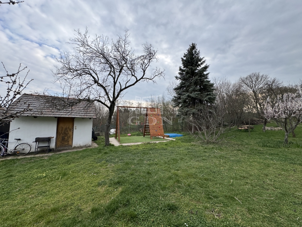 A 2333 m²-es telek gondozott, számos gyümölcsfával beültetett (birs, szilva, körte, cseresznye stb.), valamint egy kerti tároló is megtalálható rajta. Az utcafront szélessége 27 méter.