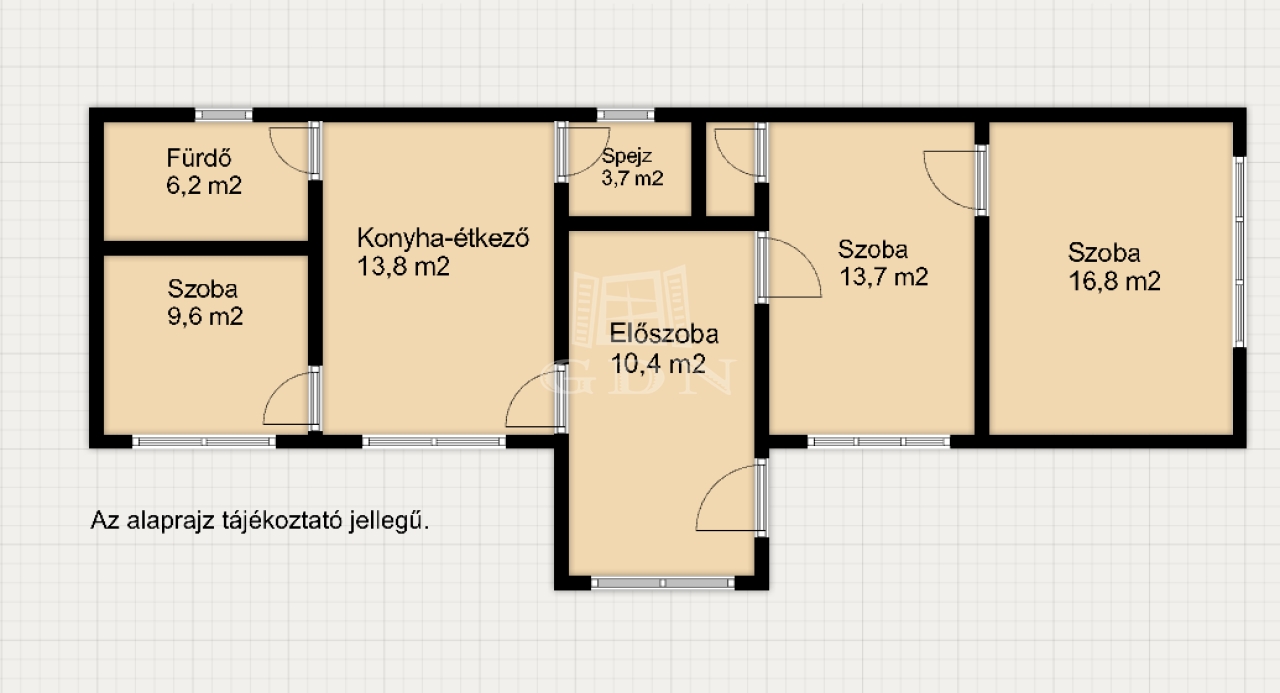- 75 m2-en ad helyet egy előtér - folyosó együttesnek, 3 szobának, egy konyhának, egy kamrának, egy tárolónak, valamint egy fürdőkáddal és toalettel felszerelt fürdőnek.
