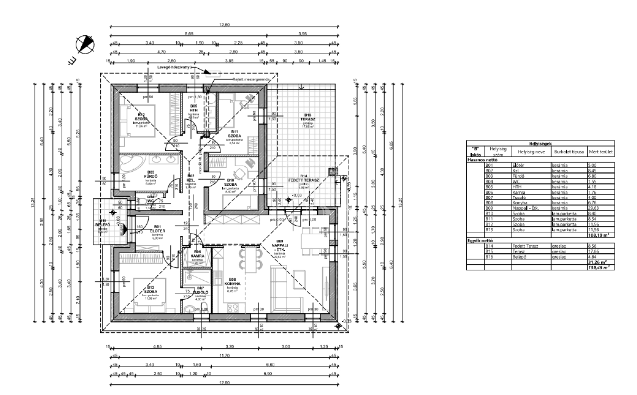 Helyiségei: előszoba 5,00 m2, közlekedő 8,45 m2, fürdőszoba 6,80 m2, wc 1,55 m2, háztartási helyiség 4,18 m2, kamra 1,78 m2, fürdő 4,00 m2, konyha 6,76 m2, nappali/étkező 29,63 m2, szoba 8,40 m2,