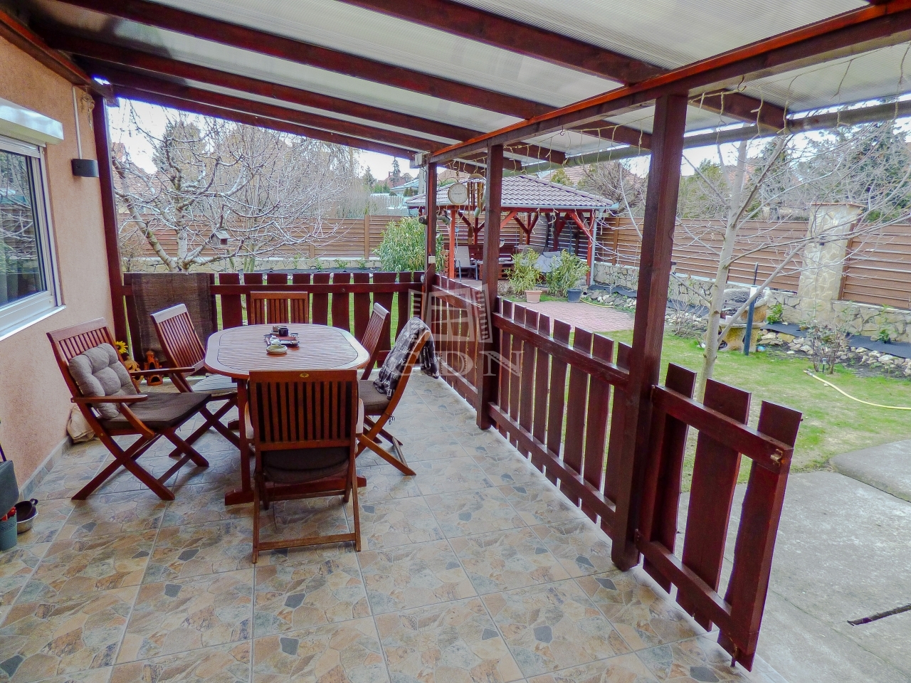 A zárt udvaron 3 autóval meg lehet állni, ebből 2 fedett, az elektromos hálózat felbővített (3*16 A), a kertben egy nagy terasz (20 nm), szaletli (16nm), tároló (20 nm), bográcsozó kapott helyet. Az öntözés fúrt kútról megoldott, a kerítés gondozásmentes.
