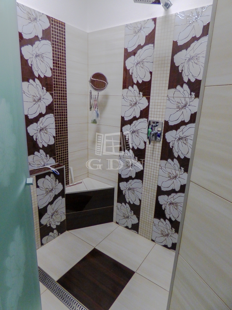 A nagyobbik lakrészen amerikai konyhás (kamrával), étkezős nappali, 4 hálószoba, 2 fürdőszoba, wc, infraszauna, gardrób, nagy terasz lett kialakítva két szinten.