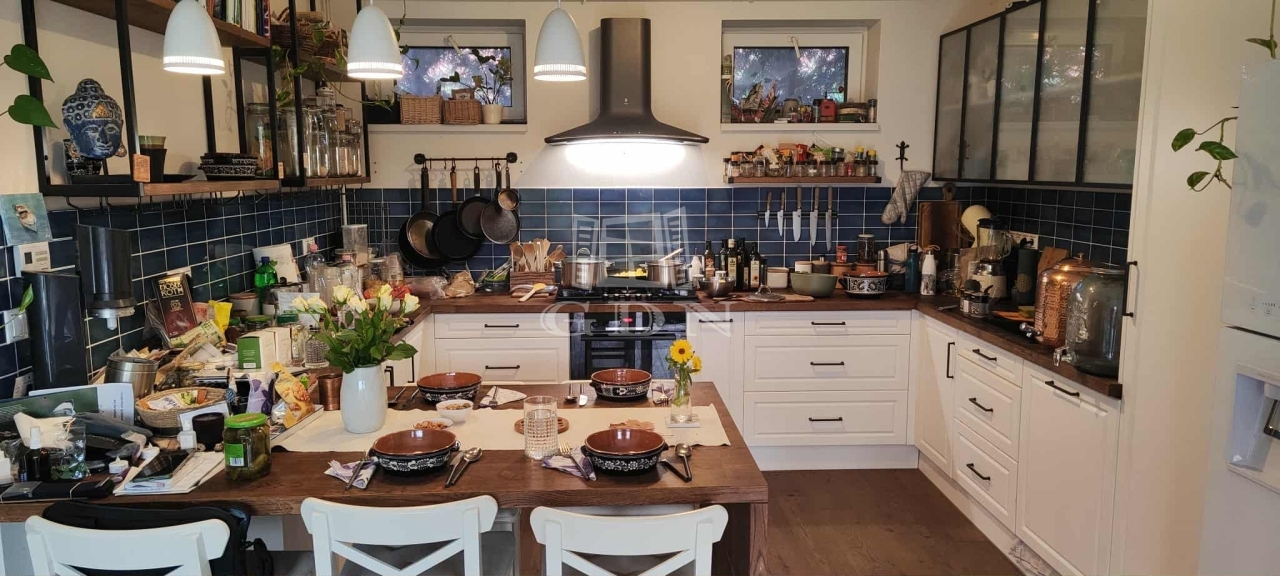 A szobákban, a konyhában és a nappaliban eredeti svéd tölgyfa padló, az előtérben és a fürdőben gyönyörű kerámia burkolatú a padozat. Az amerikai konyhás nappaliban fa konyhabútorok egyedi tervezésűek, tömör tölgyfa munkalappal, beépített elektromos elektromos sütővel, gáz főzőlappal, elektromos páraelszívóval, és mosogatógéppel valamint elektromos szelektív kukával.
