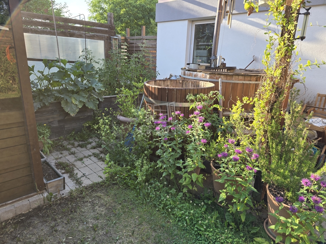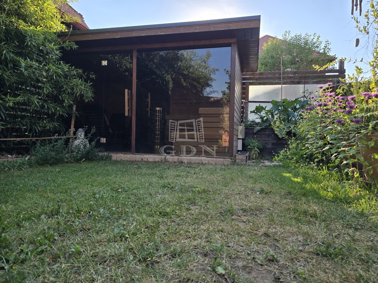 A 80 m2-es kertben kialakított kis magaságyásokban hobbikertészkedéssel lehet kikapcsolni a munkanapok után. A kert ékköve a mészkőből faragott kerti kút és a 6 méter magas fekete bambusz sor mellett, egy 6 személyes, egyedi tervezésű elektromos finn, csomómentes, rezgőnyár szauna hozzá tartozó hidegvizes merülő dézsával. A hűvösebb hónapok komfort élményét egy erdélyi fatüzelésű dézsa is fokozza.