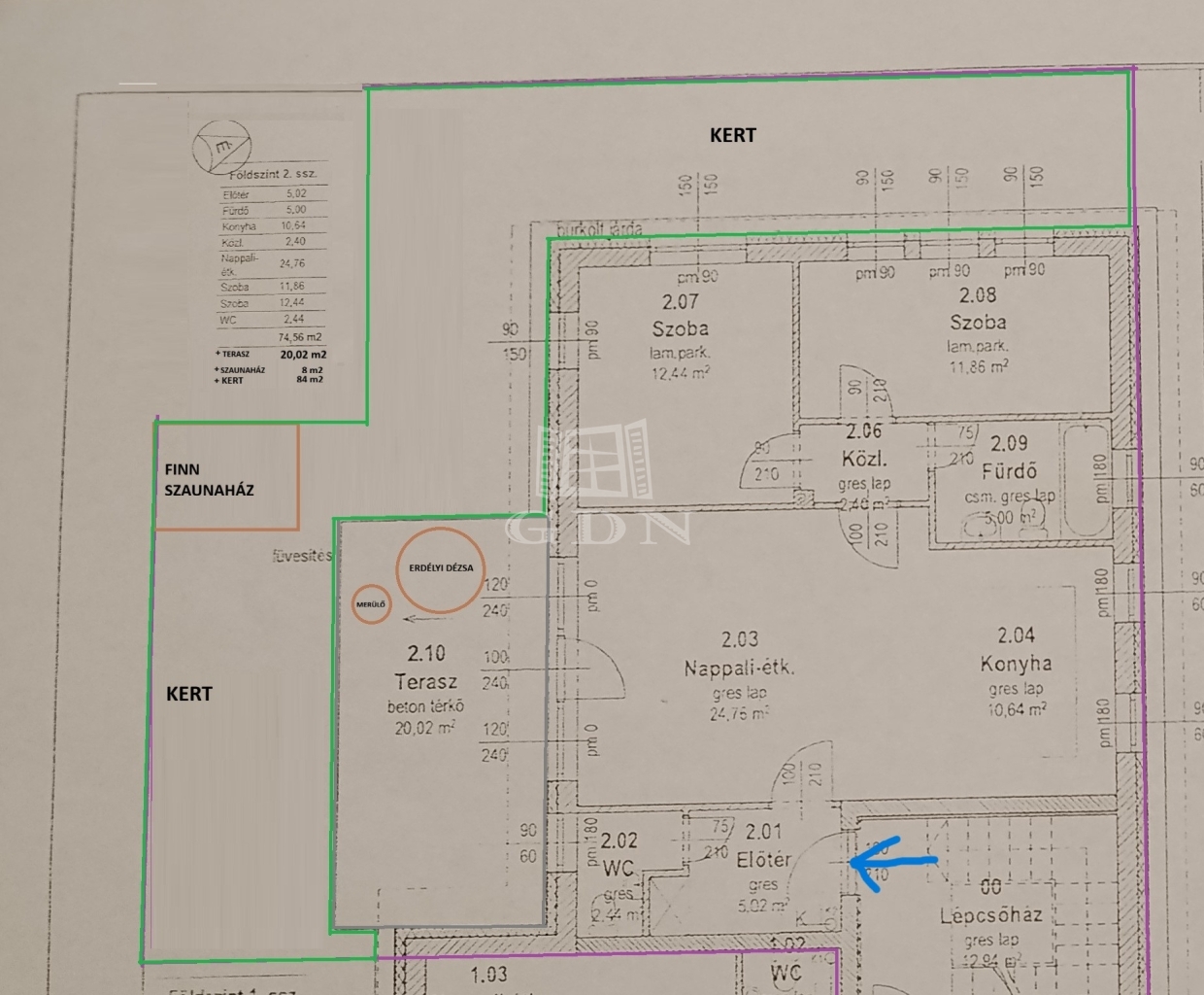 előtér - mosdó-wc - konyha-étkező-nappali-fedett terasz - előtér - fürdő-wc - szoba - szoba - kert- szaunaház