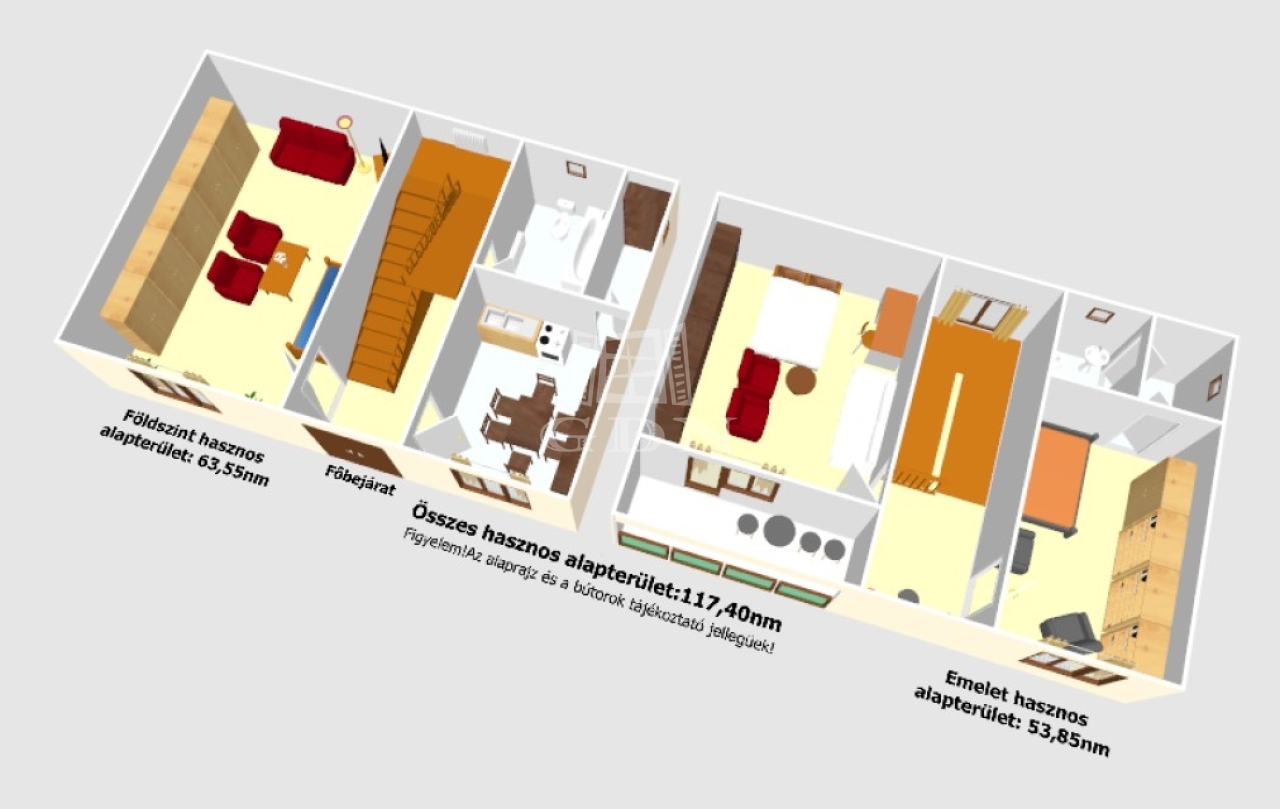 A főépület hasznos alapterülete 63,55+53,85= 117,40nm, melyben található: