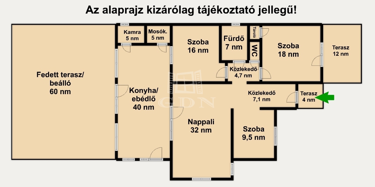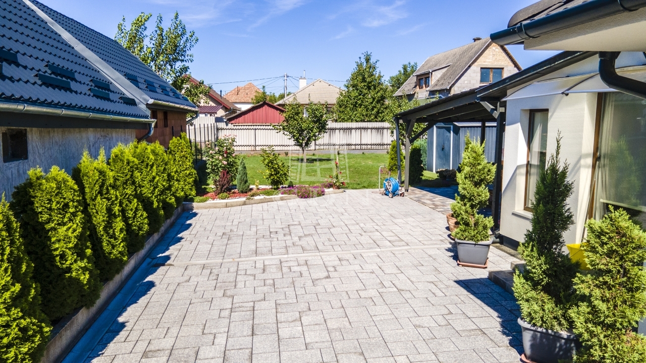 Az udvar részét képezi a 60 nm-es fedett terasz, mely egyben kocsibeálló is, valamint egy kinti zárt grillező és 3 tároló helyiség.