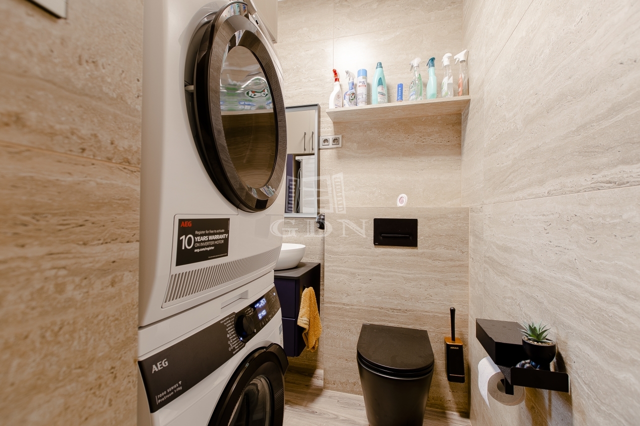 A tágas, világos nappali berendezve várja új tulajdonosát, a fürdőszobákban pedig felső kategóriás, bronz és rosegold színekben pompázó TRES csaptelepek és zuhanyok, valamint érintésmentes szappanadagolók és szemetesek szolgálják a kényelmet.