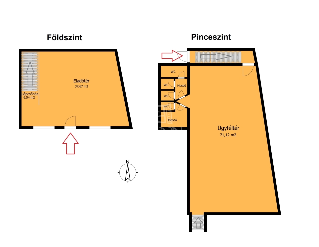 Az üzlet kirakattal és utcafronti bejárattal rendelkezik. A földszinten 44 m2, alagsorban 82 m2, összesen 126 m2 nettó alapterülettel.