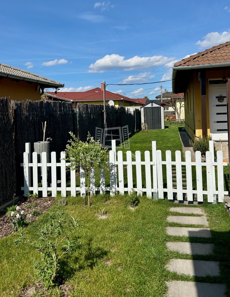 Saját telekrésze 445 m² amely szépen parkosított, 3 db. kocsibeállási lehetőséggel, a kertben található egy kisház is amely kb. 5 m²-es.