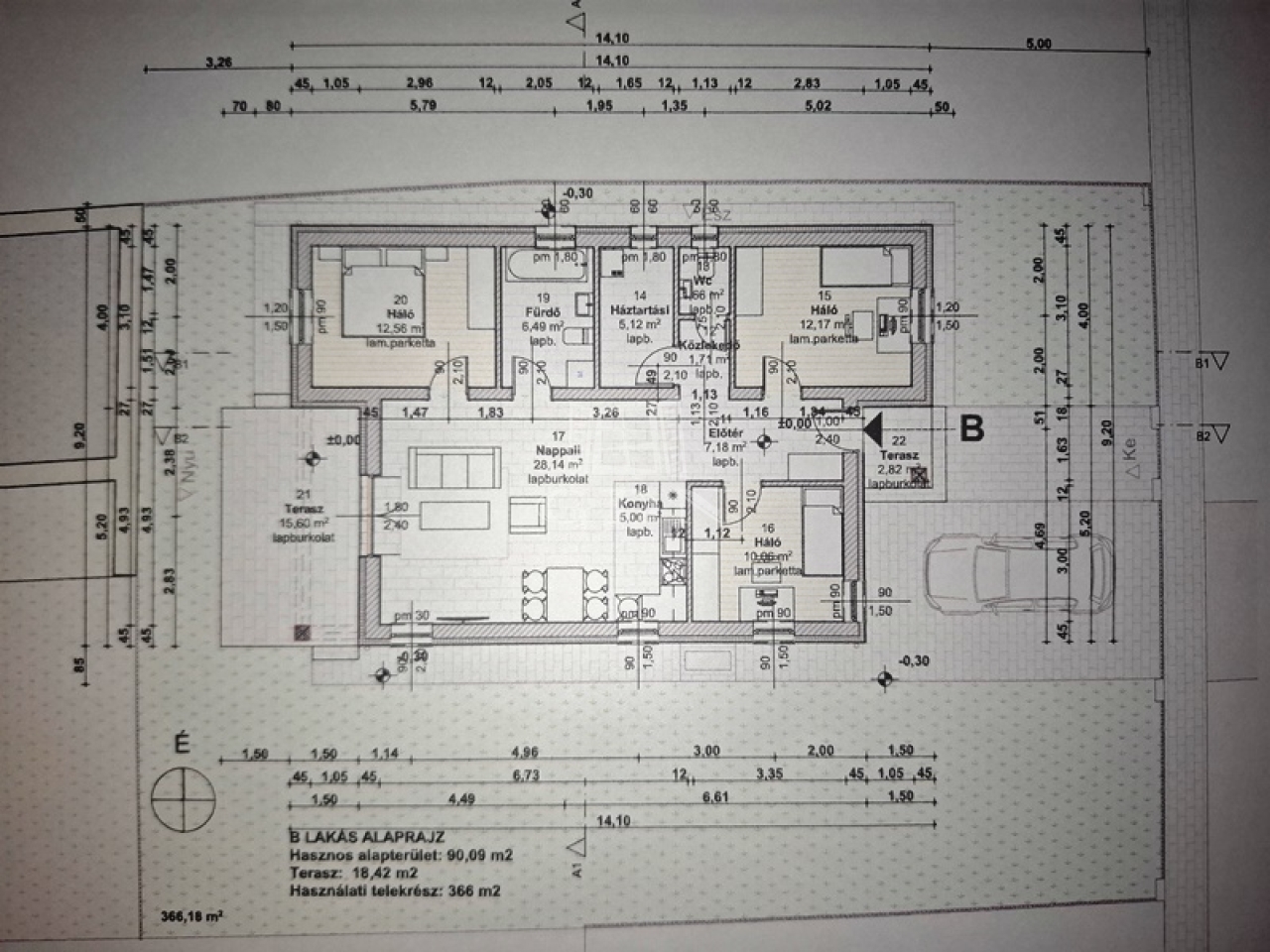 Az otthon helyiségei:nappali teraszkapcsolattal 28,14 nm, konyha 5,00 nm, szoba 10,06 nm, szoba 12,17 nm, szoba 12,56 nm, fürdőszoba 6,49 nm, háztartási h 5,12 nm, wc 1,66 nm, közlekedő 1,77 nm, terasz 18,42 nm.