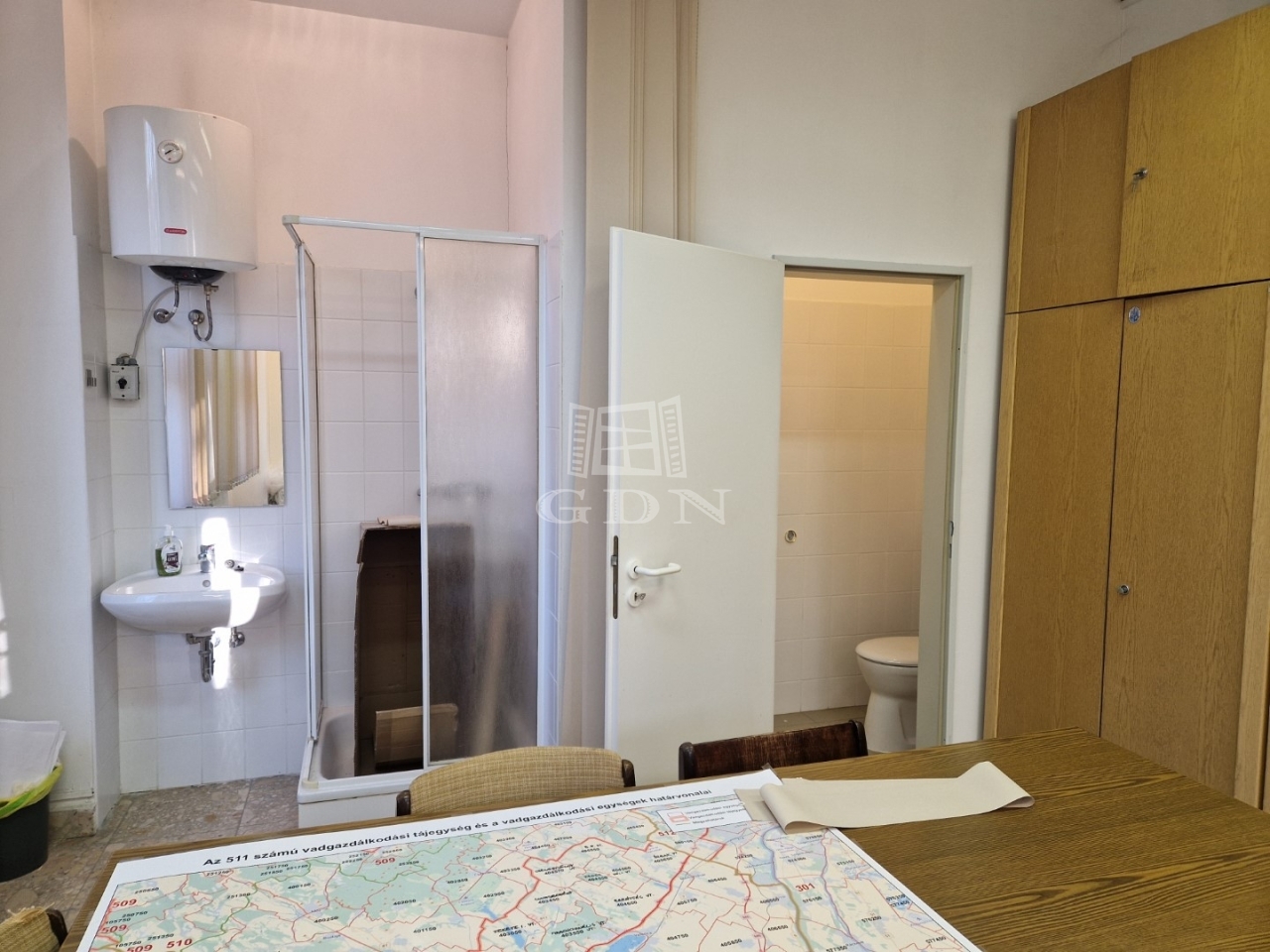 Elosztását illetően egy tágas előtérből / váróból, három önálló helyiségből (irodából / rendelőből) és négy vizesblokkból áll. Minden helyiséghez saját wc/kézmosó tartozik.