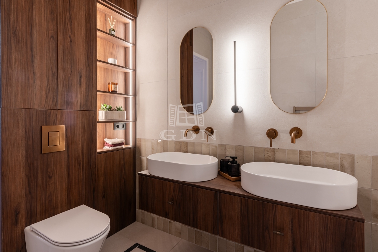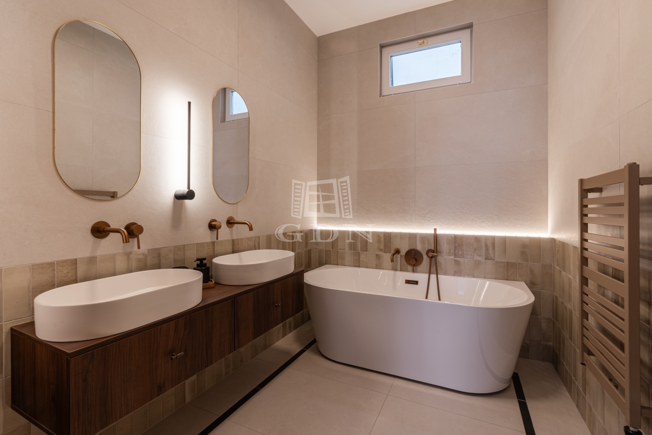 Az ingatlan a tulajdoni lapon 85 nm, a valóságban 88 nm-es tágas tereivel, két hálószobával, két fürdőszobával, amerikai konyhás nappalival és impozáns tükörfelületekkel hódít. A komfortot minden helyiségben klíma, valamint padlófűtés és kombi kazán garantálja.