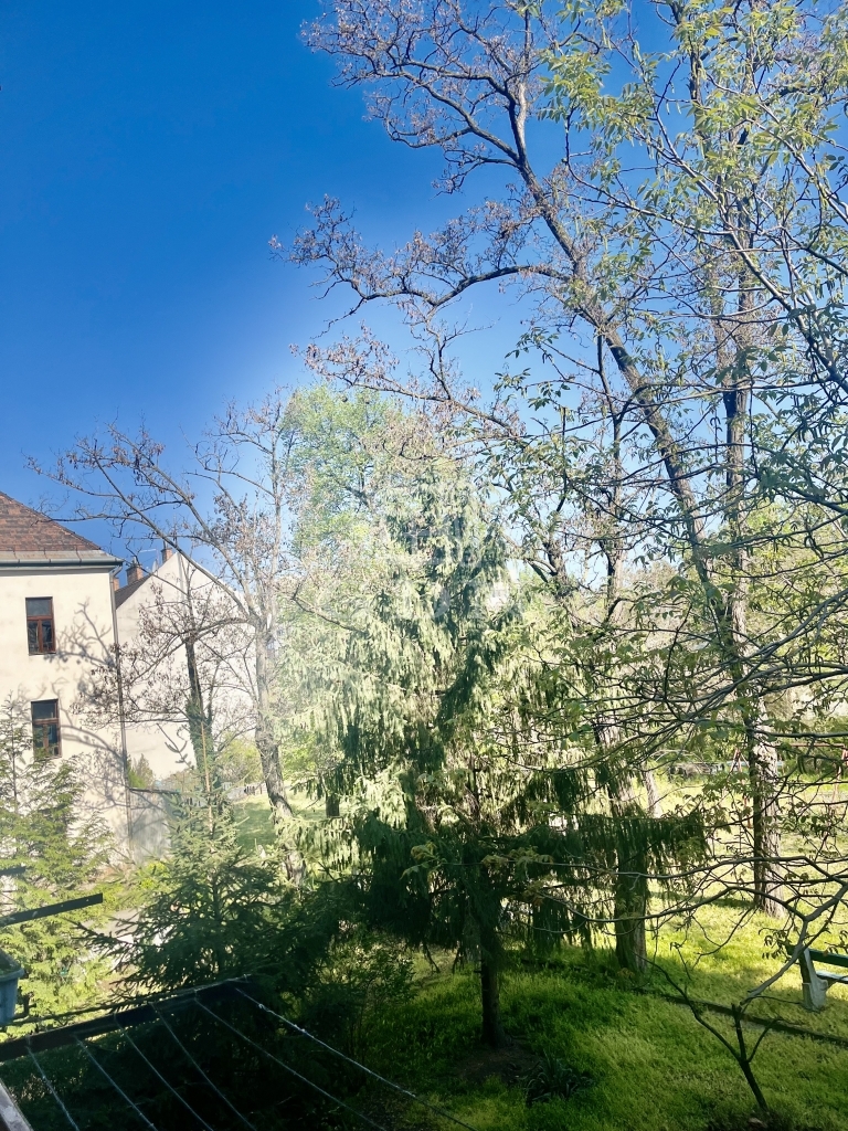• a nagyobb szoba délnyugati fekvésű, napfényes, fákkal szegélyezett utcára néz