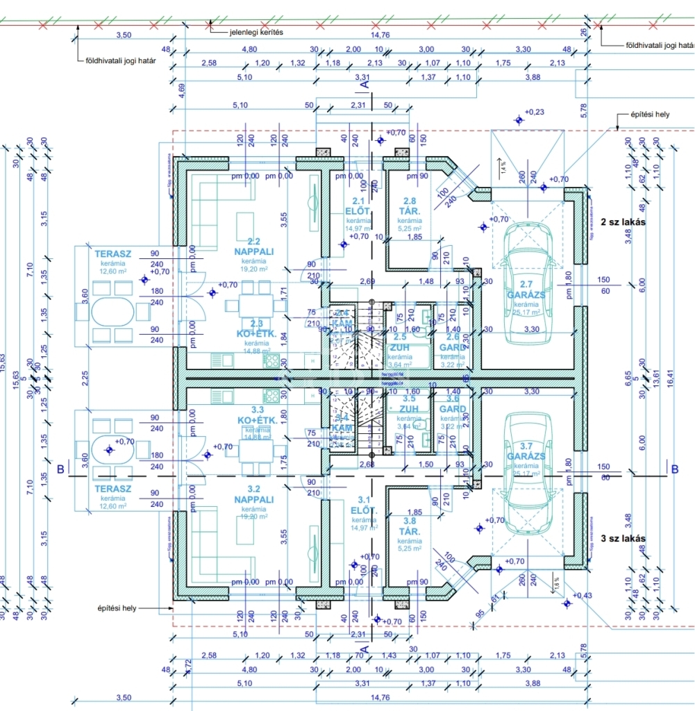 Telek: 1300 m² összesen (lakásonként min. 400 m² saját, leválasztott rész)