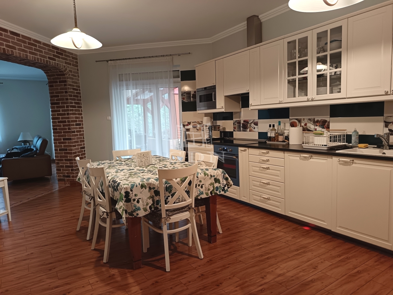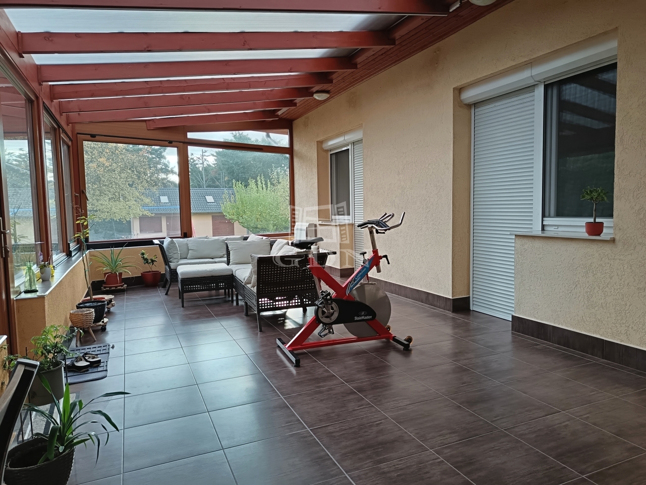 A nappaliból a beépített (téli kert szerű) teraszra érkezünk ki, amely hozzávetőleg 30 nm nagyságú.