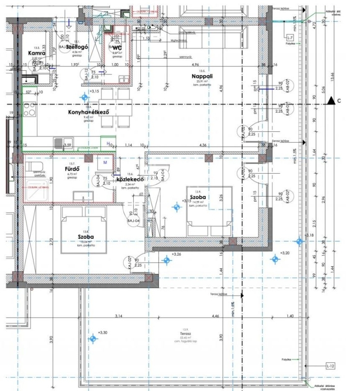 A 13-as számú lakás nettó fűtött alapterülete 81 m2, melyhez egy fantasztikus, kuriózumnak tekinthető 53 m2-es erkély is tartozik. A lakásban a tágas és világos amerikai konyhás nappalin túl további 2 szoba, előtér, fürdőszoba, mellékhelyiség, közlekedő és egy kamra került kialakításra.