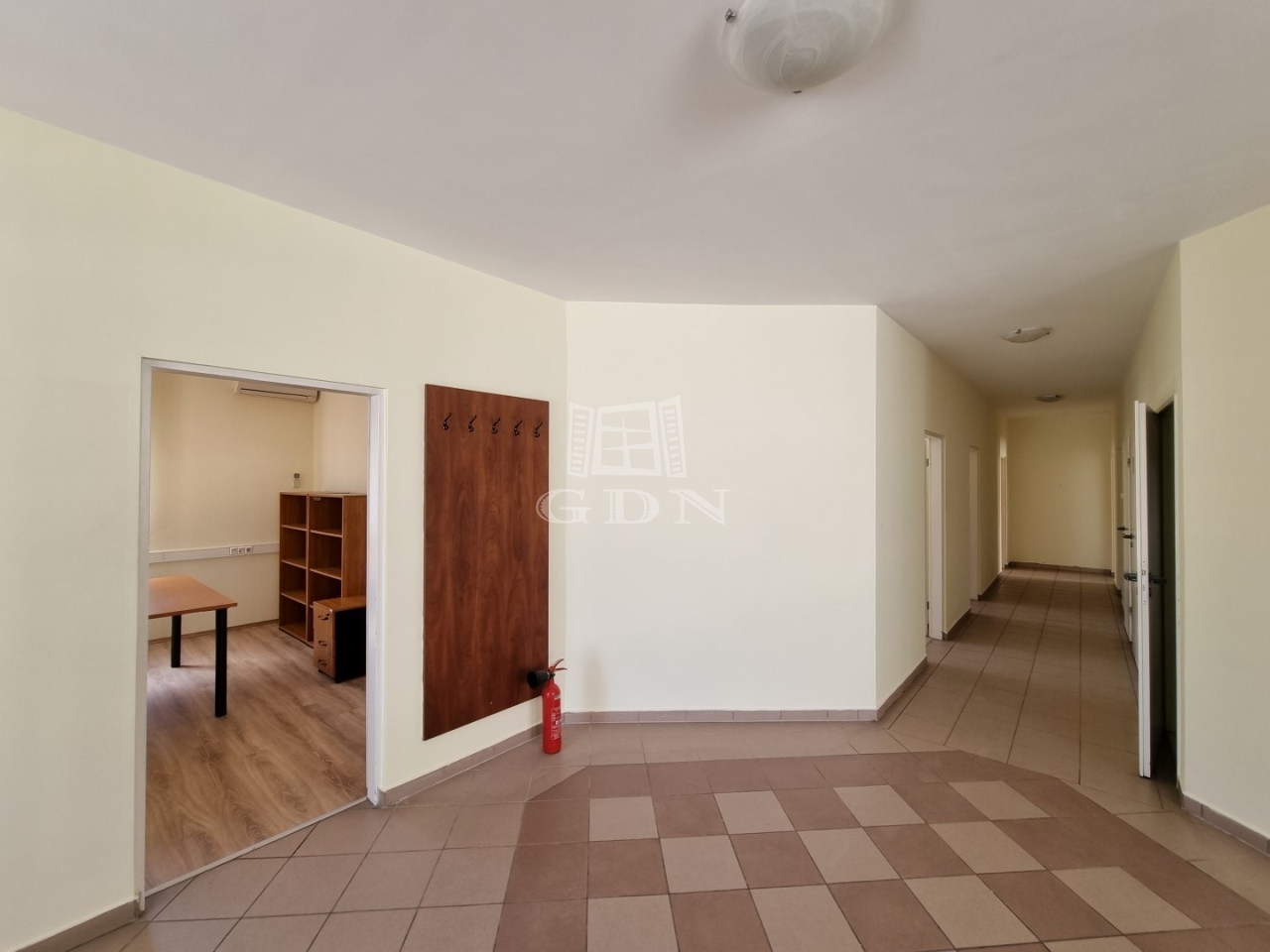 Az irodaépületben egy nagy ügyfélfogadó / recepciós tér, kis teakonyha, női-férfi wc, kiszolgáló helyiség zuhanyzóval, egy kéziraktár és 5 db önálló irodahelyiség került kialakításra. Minden irodahelyiség klimatizált, bútorozott, jó állapotúak.